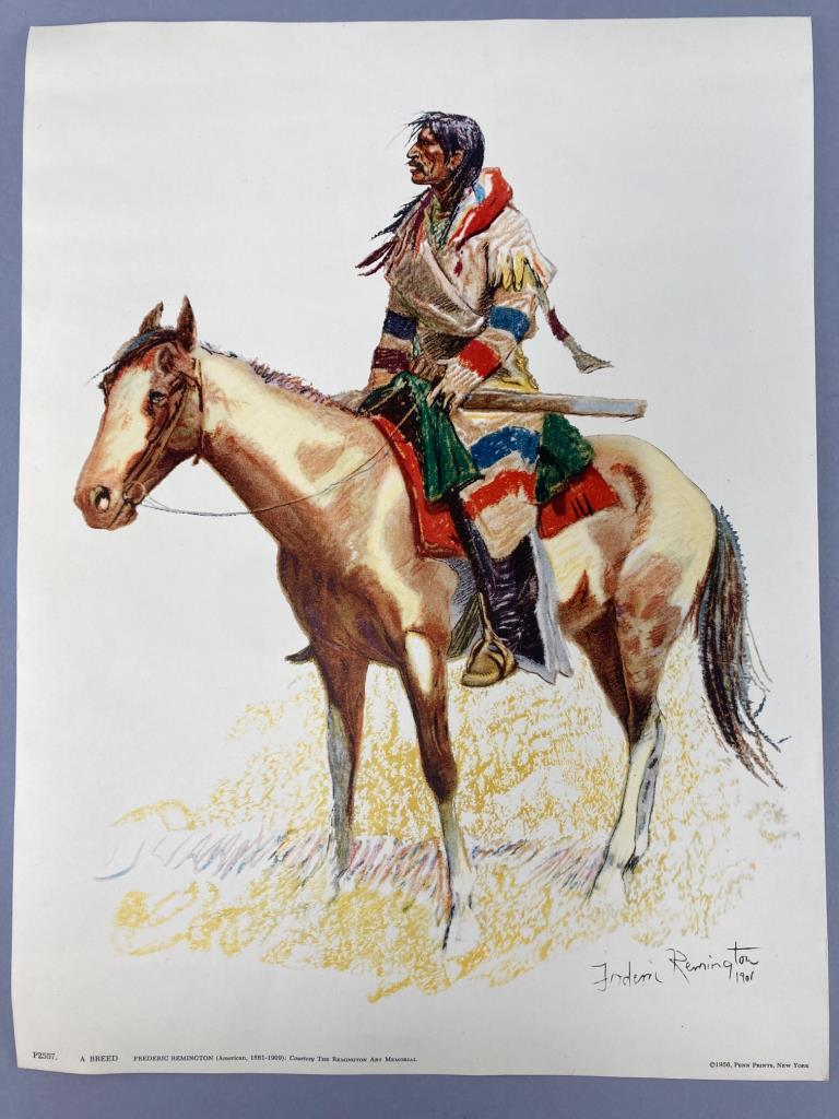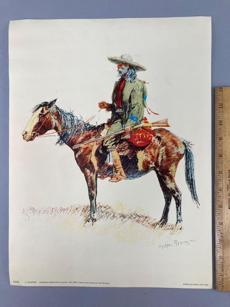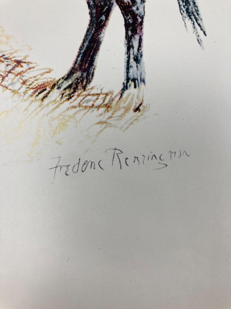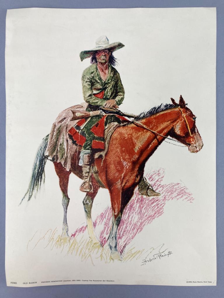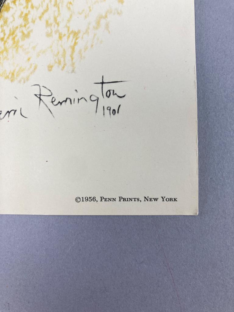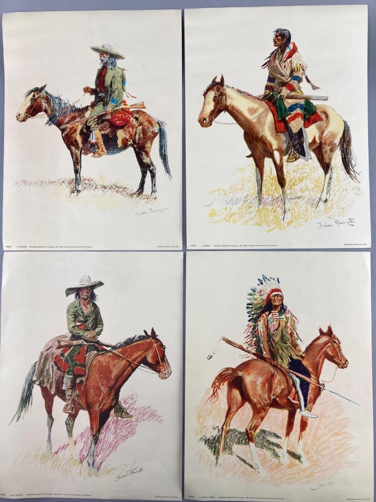 Four color prints after Frederic Remington, depicting horseback riders in various scenes. Published by Penn Prints, New York, dated 1956. Signed in plate by the artist; lithographically reproduced.