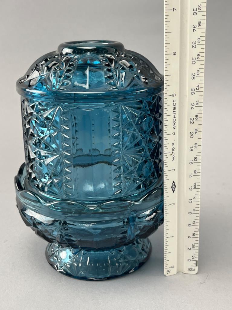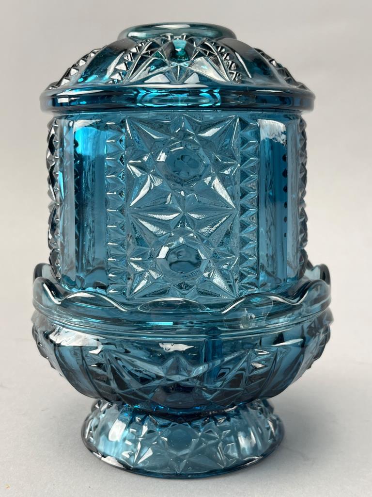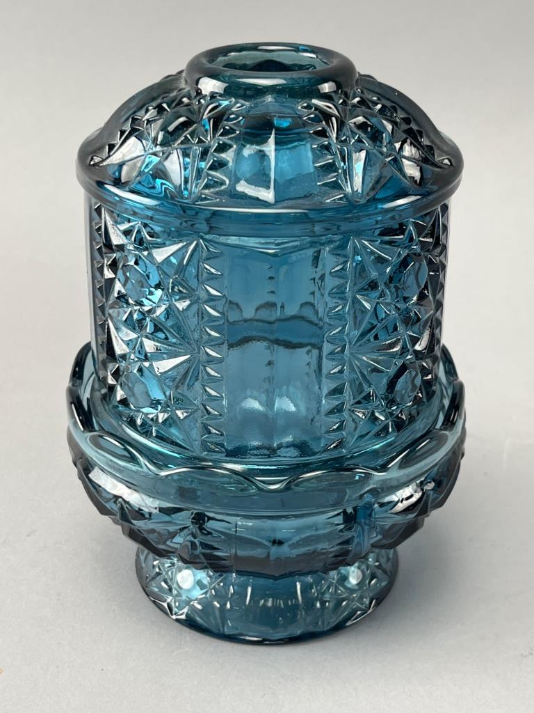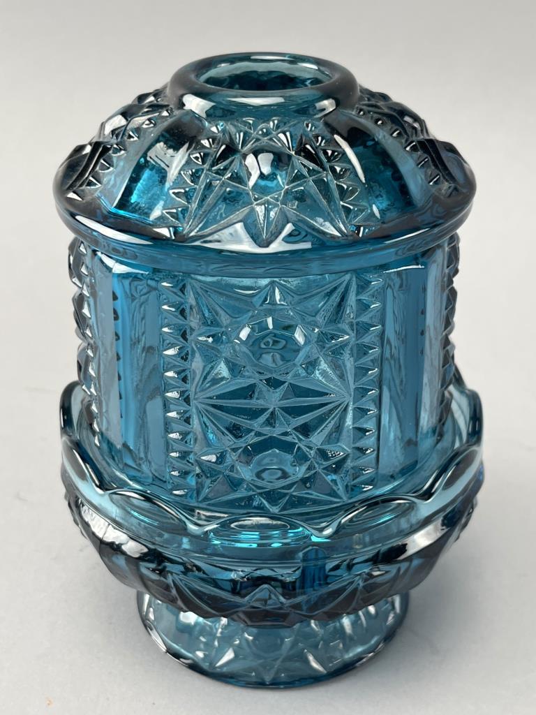 Blue pressed glass fairy lamp by L.E. Smith. Features intricate pressed starburst and geometric patterns.