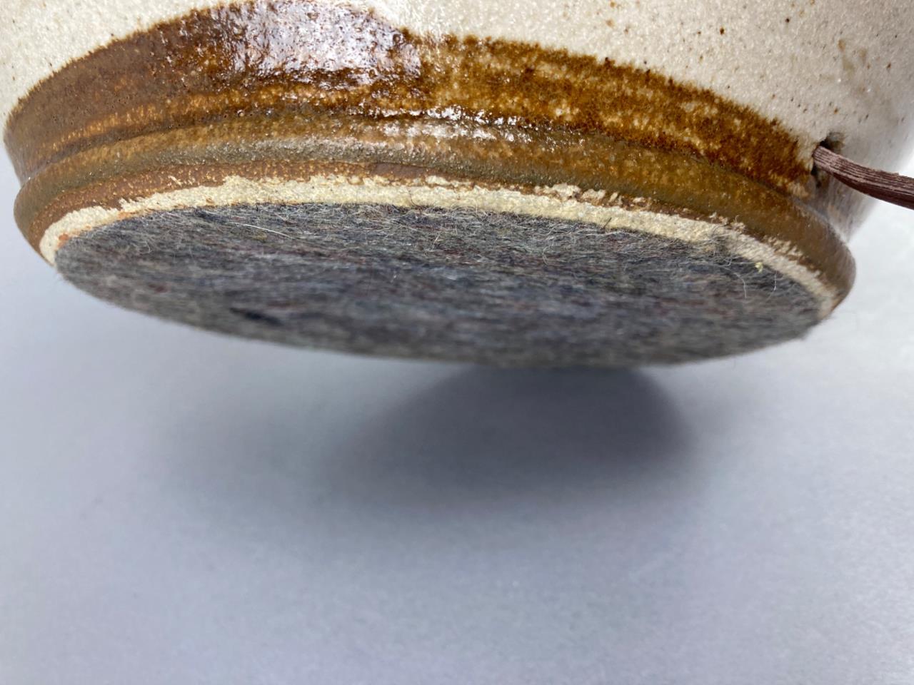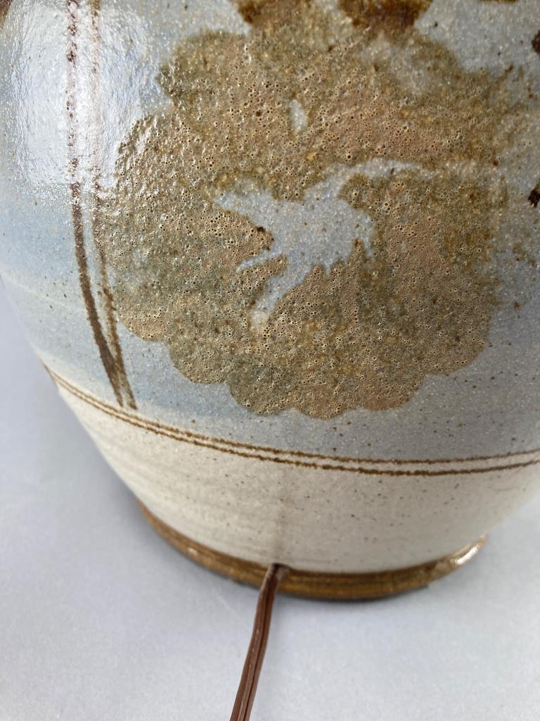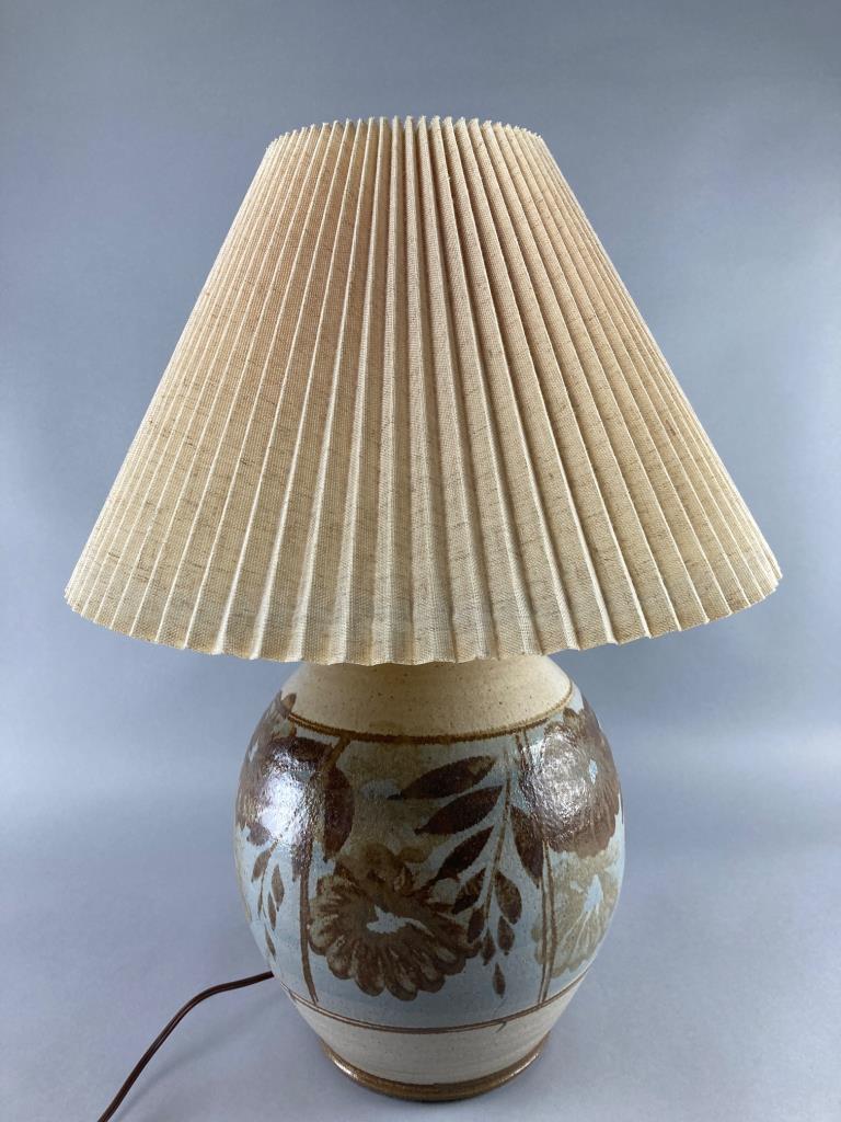 Stoneware pottery lamp featuring floral decoration in earthy tones. Includes a pleated, textured lampshade. Lamp is wired for electricity. With shade pick up only. Measures