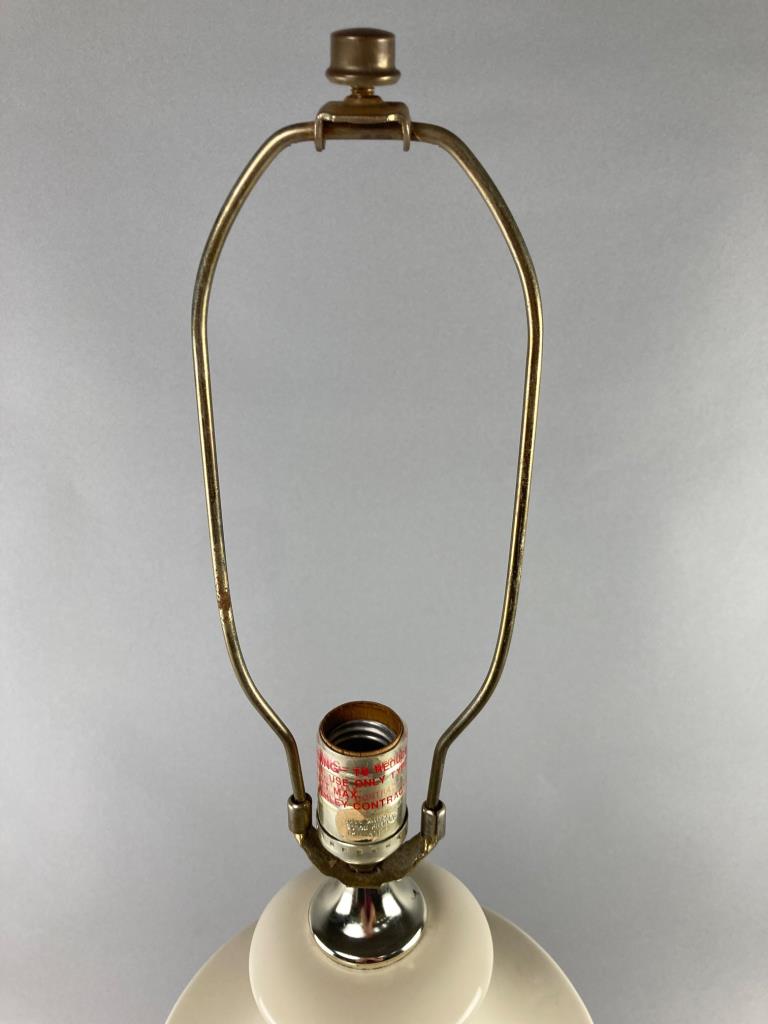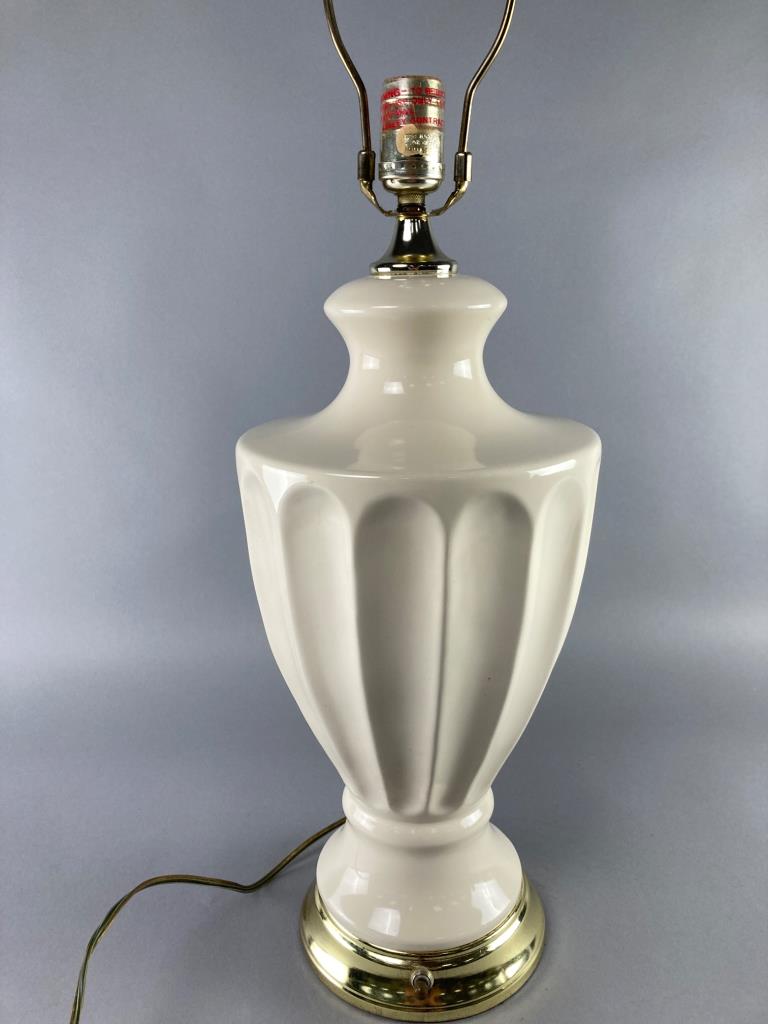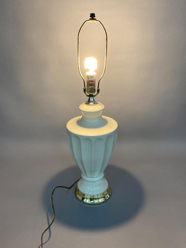 White ceramic table lamp featuring a fluted urn-style body, a polished brass base with a rotary switch, and a harp for shade attachment. Wiring and plug are visible in provided images. Shade not included. Measure 29.5″.