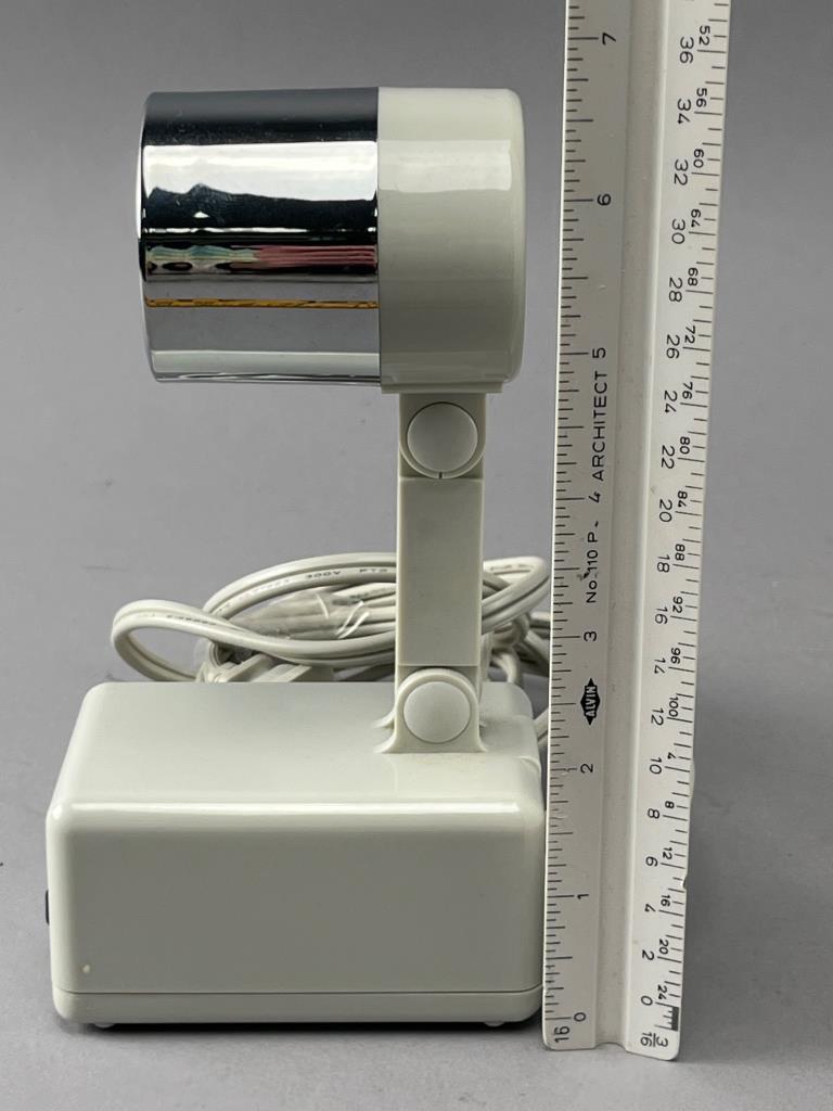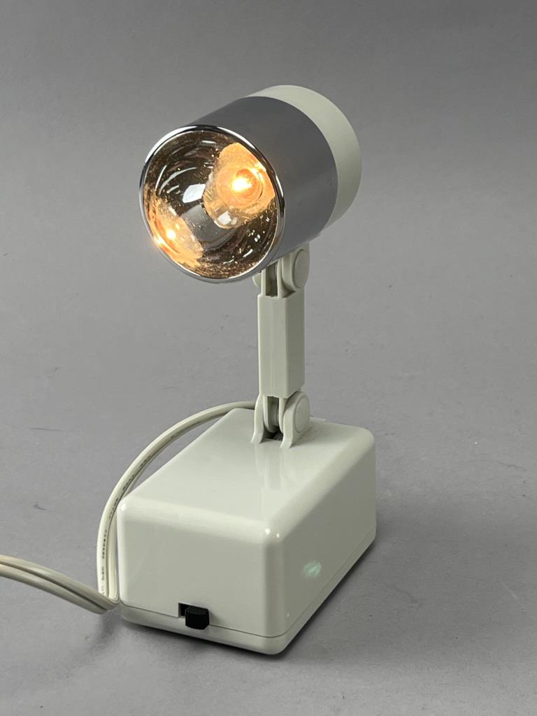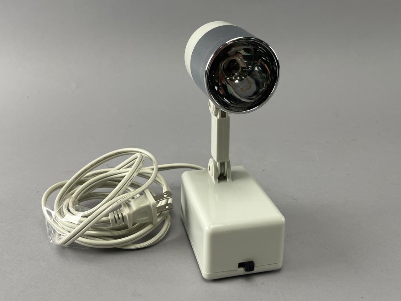 Compact adjustable desk lamp with a glossy metallic shade and off-white base. Includes an integrated switch and plug-in cord for operation. Designed for directed lighting applications.