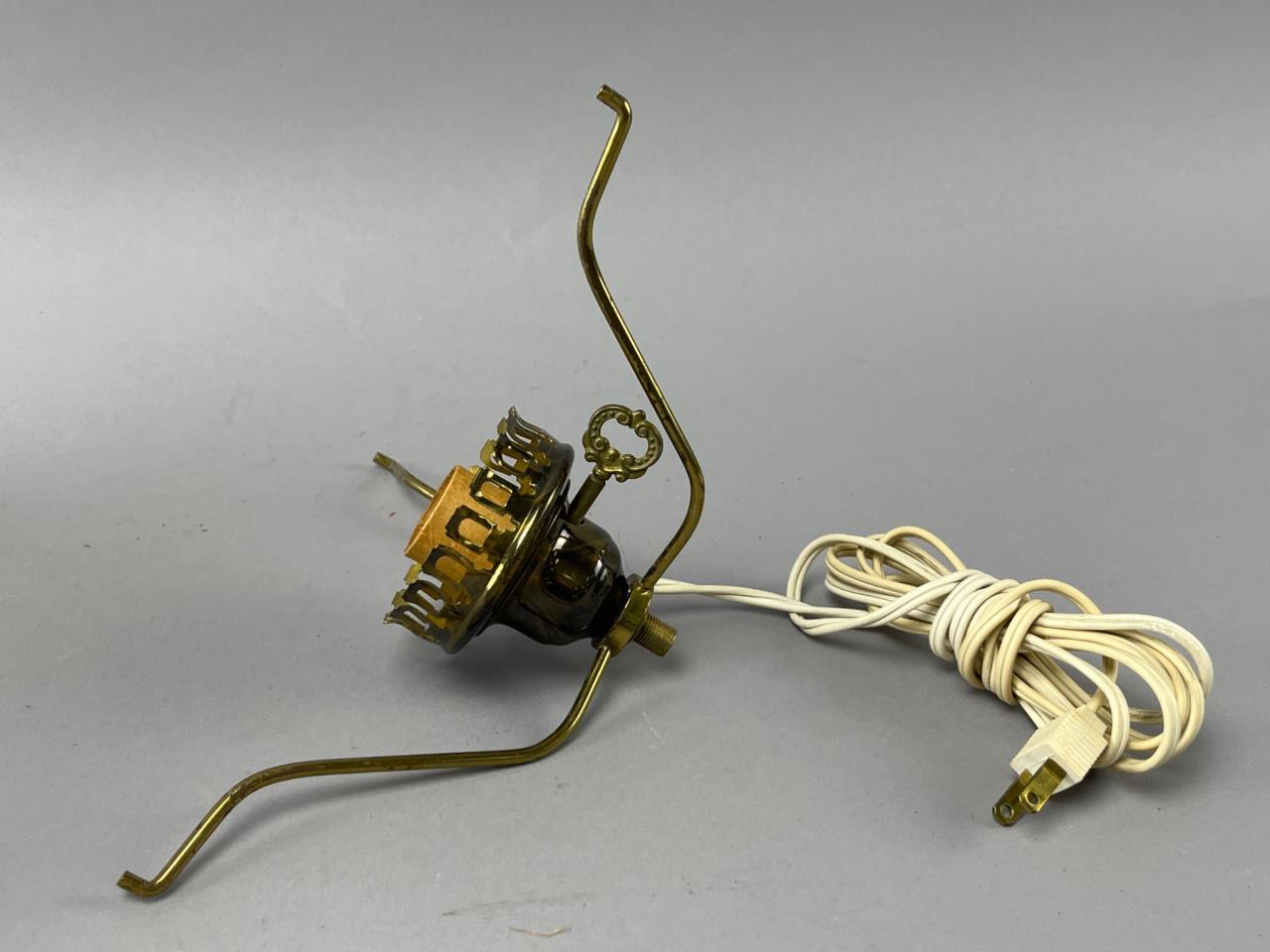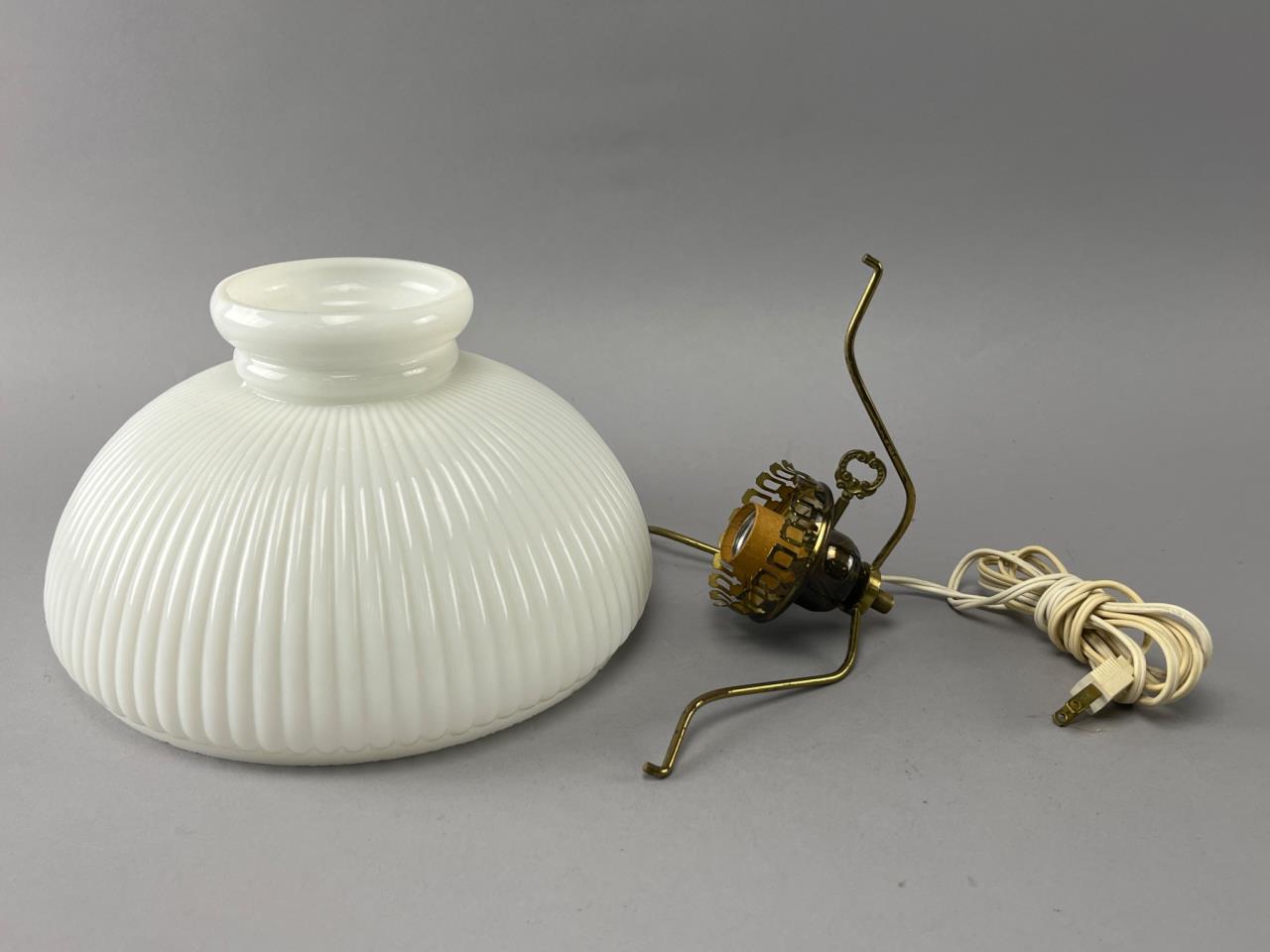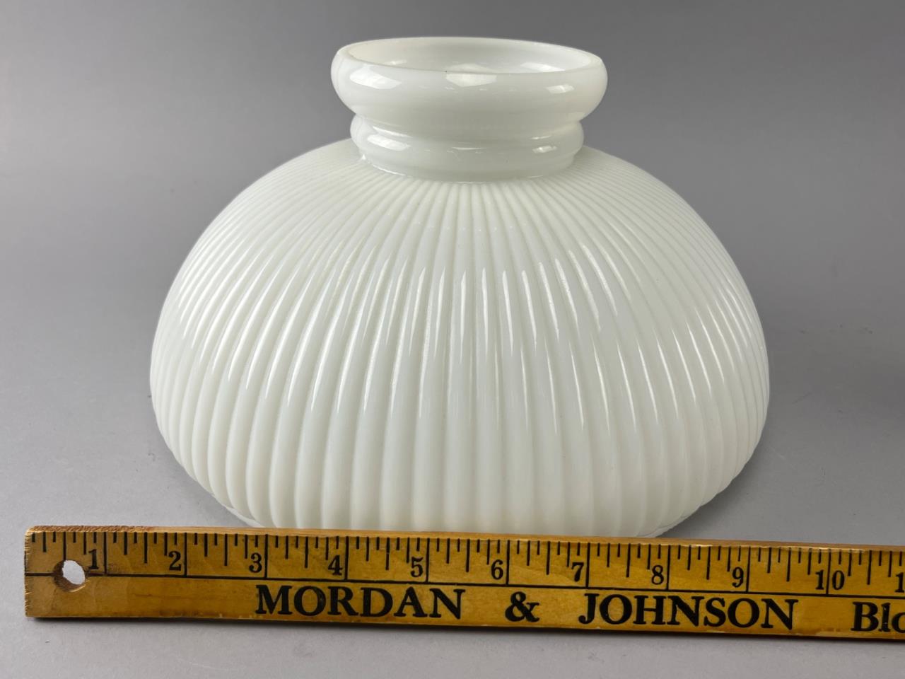 White ribbed glass lamp shade paired with a metal fixture and corded plug. Plug not tested. Visible wear on the metal arms.