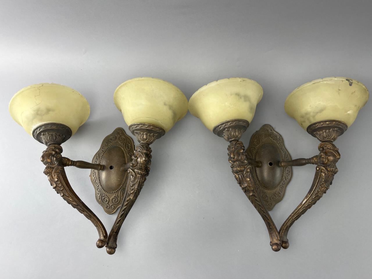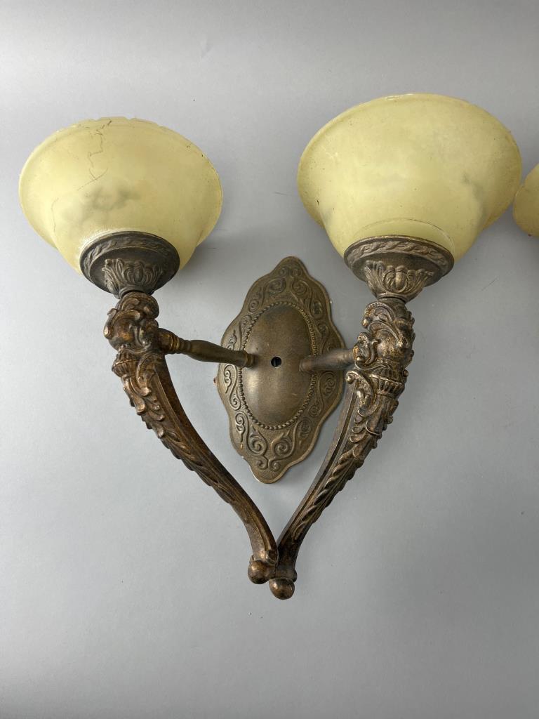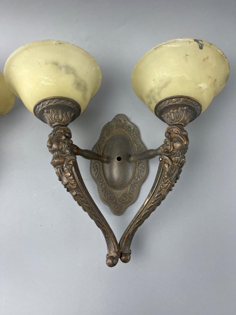 Bronze-tone wall sconces with ornate backplates and dual molded glass shades. Floral and scroll details on arms. Wiring visible on back. Some wear and surface marks on glass shades.