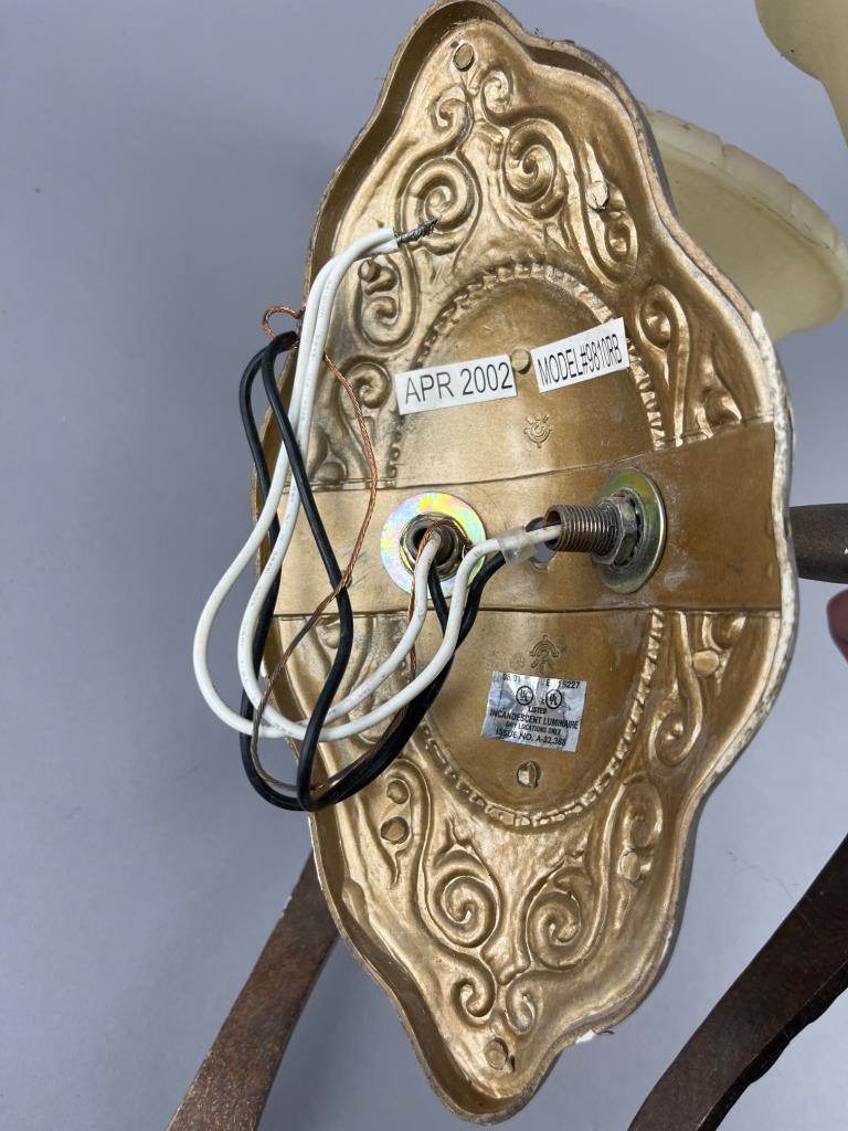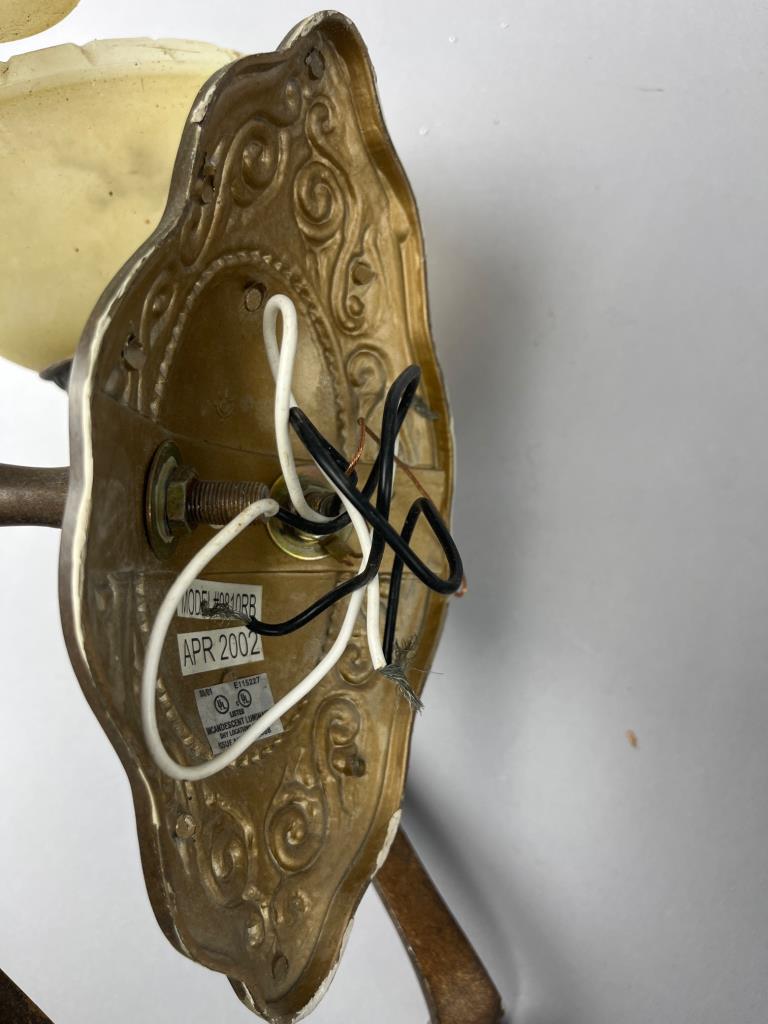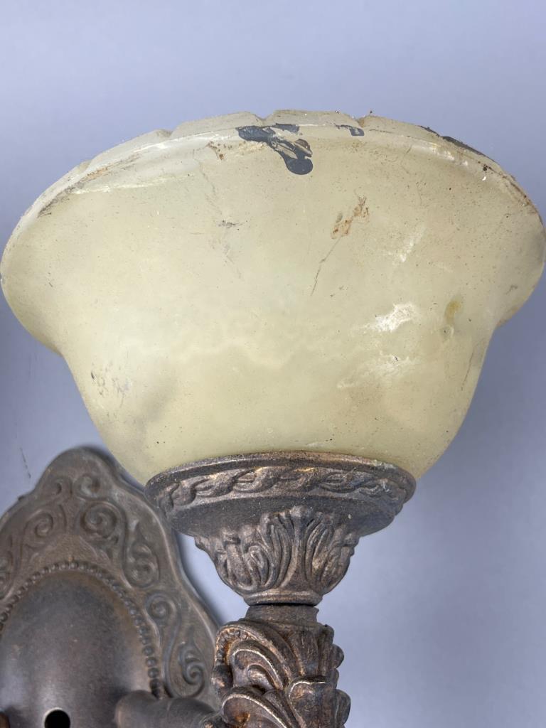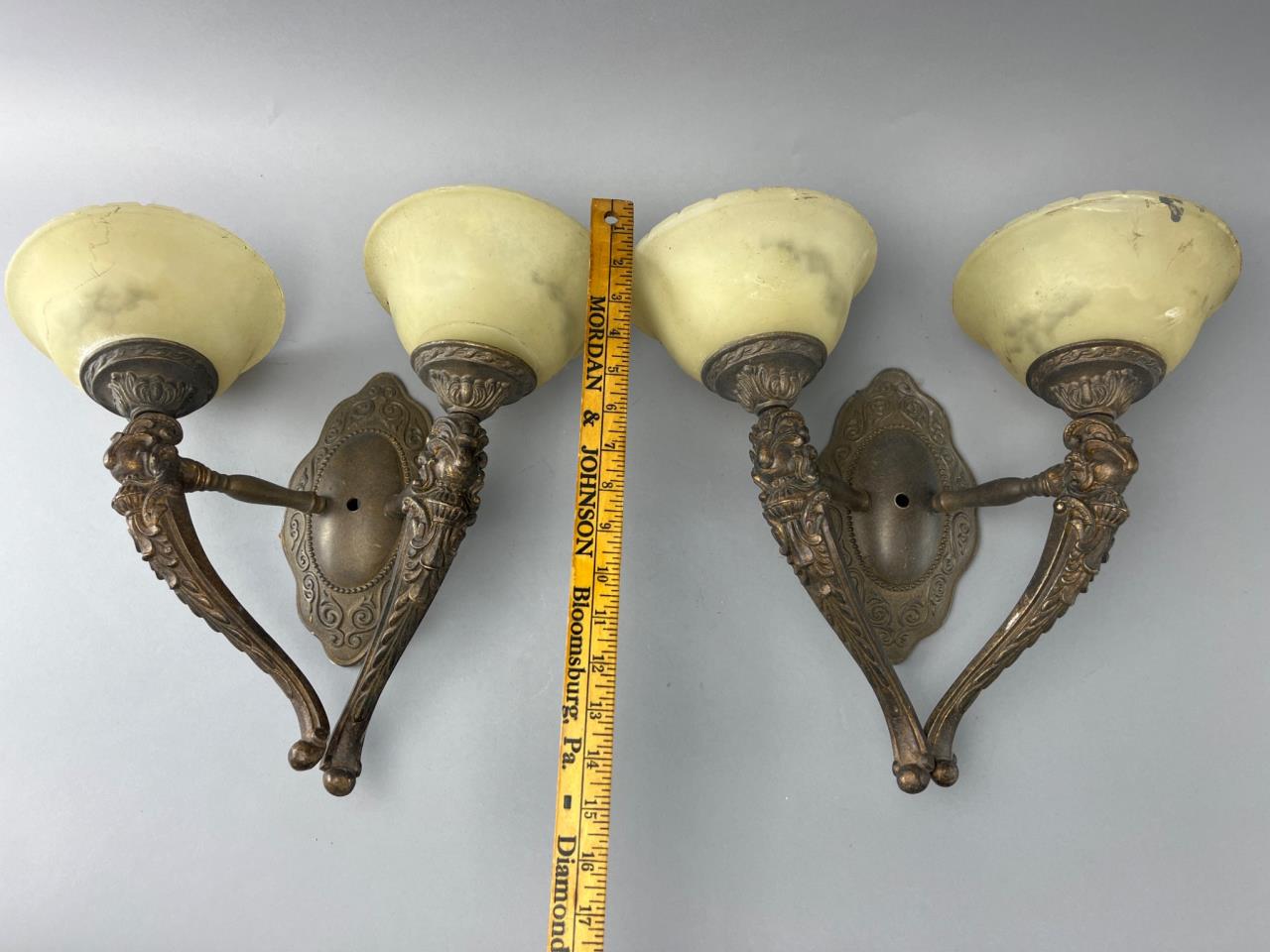 Bronze-tone wall sconces with ornate backplates and dual molded glass shades. Floral and scroll details on arms. Wiring visible on back. Some wear and surface marks on glass shades.