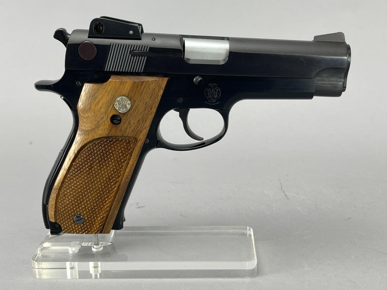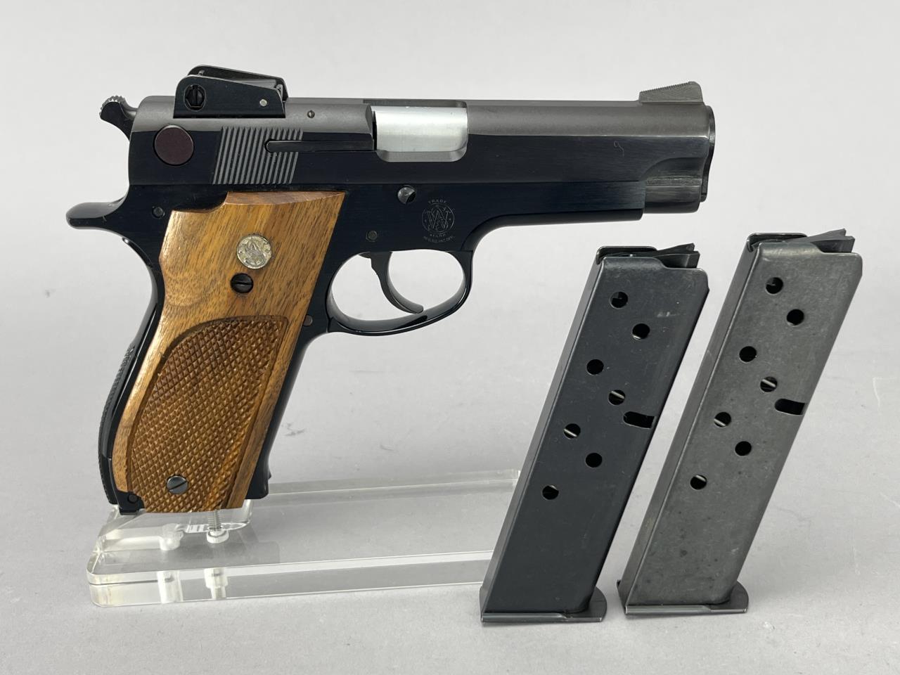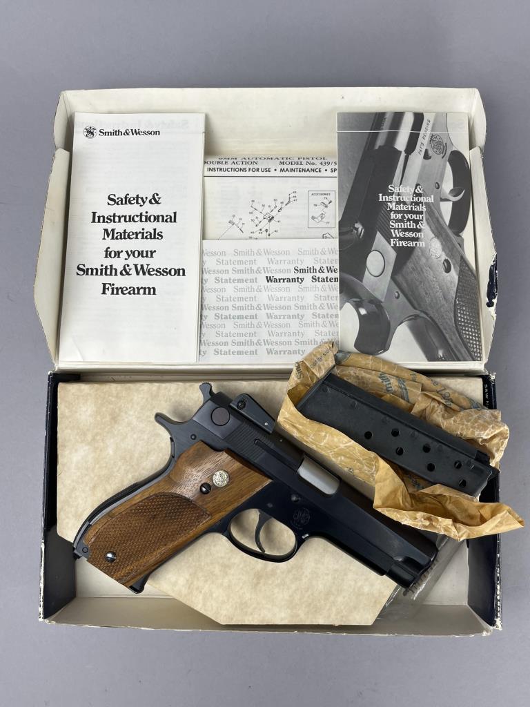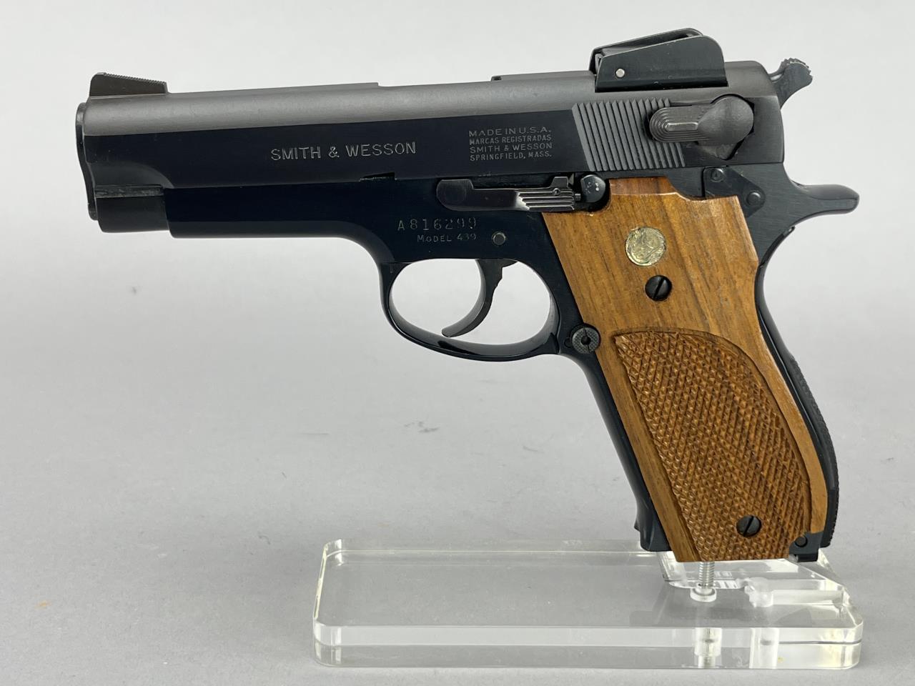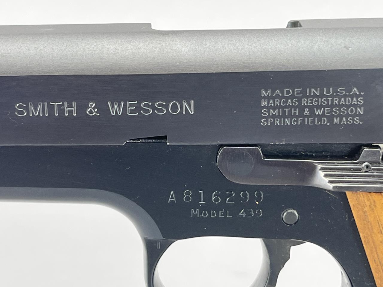 Smith & Wesson Model 439, 9mm semi-automatic pistol with double/single action. Features include a 4-inch barrel, blued steel finish, and textured wood grips adorned with a Smith & Wesson medallion. The slide is marked with the manufacturer’s name and location, ‘Smith & Wesson Springfield, Mass.’ Serial number A816299 indicates production during the mid-1980s. The pistol includes two 9-round magazines, adjustable sights, and is accompanied by its original factory box and instructional materials. Background check required for purchase.