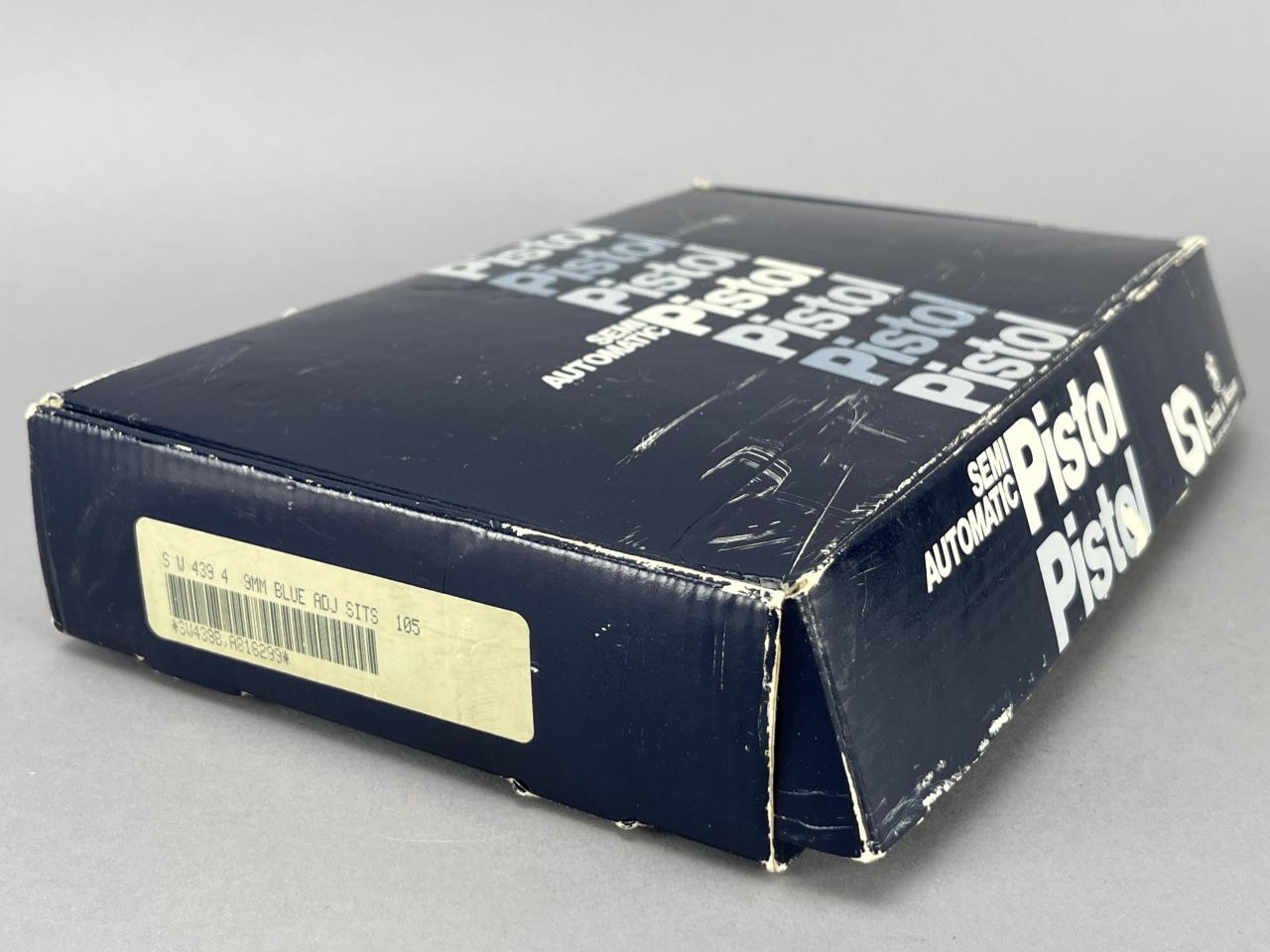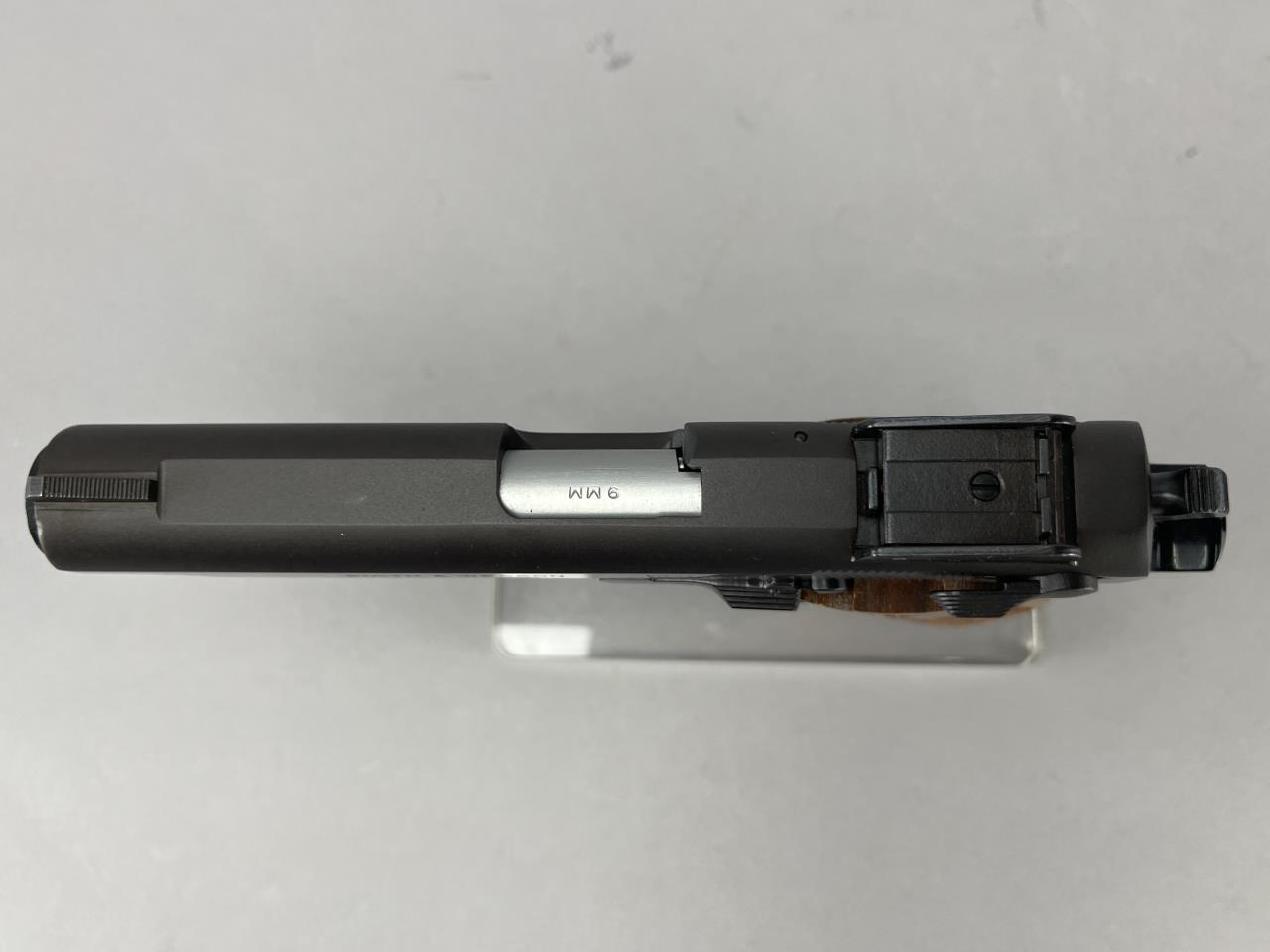 CONDITION: The pistol retains the majority of its original blued finish with minimal handling marks and light edge wear. The textured wood grips are in excellent condition, showing sharp checkering and no visible cracks or heavy wear. Mechanically, the action cycles smoothly with no signs of wear or malfunction. The bore appears bright and free of fouling, though further inspection is recommended. Both included magazines exhibit typical wear with functional springs. The original factory box shows edge wear and minor damage but remains structurally sound. Instructional materials are complete and intact.