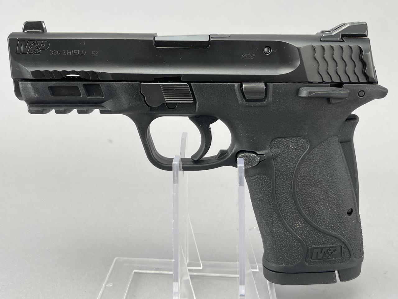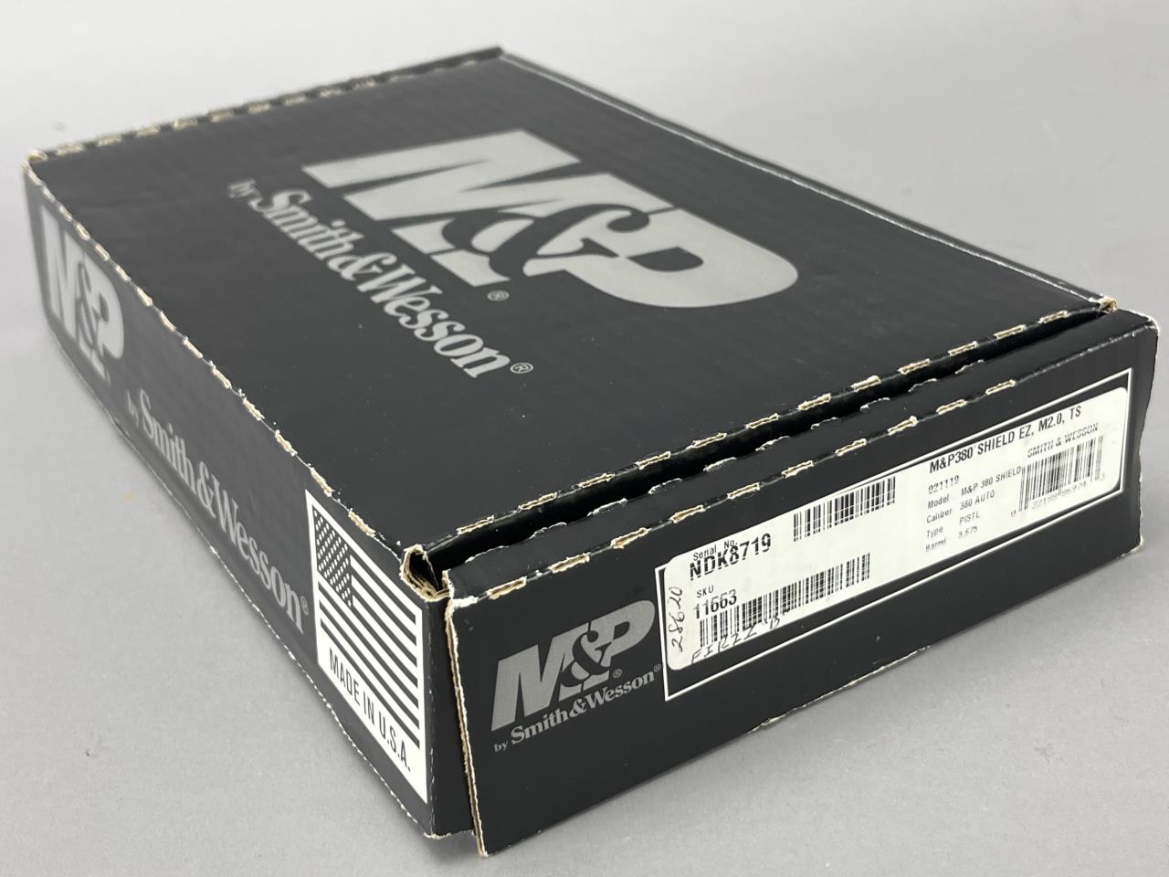 Smith & Wesson M&P Shield EZ, .380 ACP, semi-automatic pistol, serial number NDK8719. Featuring a 3.75-inch barrel, this Model 2.0 firearm is manufactured in the USA. The pistol has a black polymer frame with integrated textured grips and a matte black slide, marked with ‘Smith & Wesson Springfield, MA U.S.A.’ and ‘380 AUTO.’ It comes complete with two 8-round magazines, an accessory rail under the slide, and easy-rack slide serrations. The pistol includes its original box, factory paperwork, and packaging.
