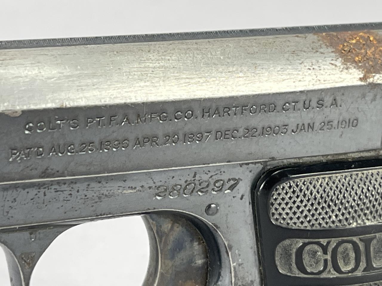 Colt Vest Pocket Model 1908, .25 ACP caliber semi-automatic pistol. Featuring a 2-inch barrel and a steel frame with a blued finish. The pistol is equipped with black checkered grips, each marked ‘Colt’ and displaying the iconic prancing horse emblem. The slide is marked ‘Colt Automatic Calibre 25’ on one side and ‘Colt’s PT.F.A. MFG. Co. Hartford, CT, U.S.A. Pat’d Aug. 25, 1896, Apr. 20, 1897, Dec. 22, 1903, Jan. 25, 1910’ on the opposite side. Serial number 280297 is visible on the frame, dating this firearm to 1922 based on Colt production records. This compact pistol, also known as a pocket hammerless design, is a classic collectible in early 20th-century firearm manufacture. Background check required.