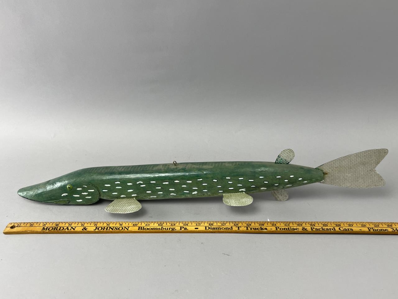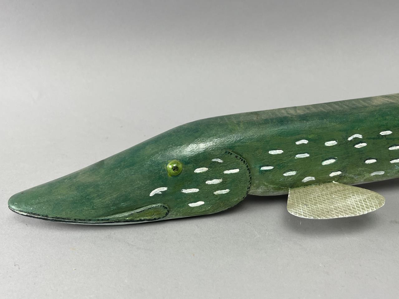 Hand-carved folk art northern pike fish decoy, measuring 32 inches in length. Crafted from wood with a painted green body, accented with white detailing to resemble the patterns on a pike. Features include textured metal fins and a tail with a naturalistic pattern, along with carved gills, a pointed snout, and a single attachment ring on the top for use or display. The decoy demonstrates skilled craftsmanship and would serve as a striking decorative piece or addition to a collection of folk art or fishing memorabilia.