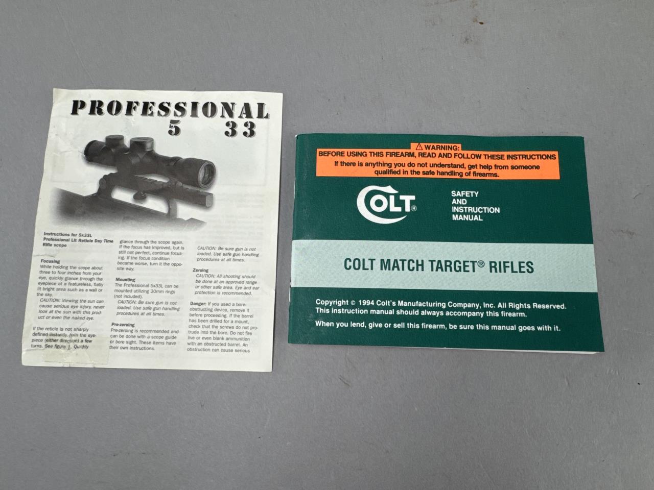Colt Match Target HBAR Competition Rifle chambered in .223 Remington/5.56x45mm NATO with a 21-inch heavy chrome-lined barrel marked “C MP 5.56 NATO 1/9 HBAR.” The firearm features a matte black finish, a forged aluminum receiver marked “Colt’s Mfg. Co. Inc., Hartford, Conn., U.S.A.,” and A2-style sight adjustments integrated into the carry handle. Notable elements include a fixed synthetic stock and an upper handguard with ribbed texturing for a secure grip. A muzzle brake is affixed to the threaded barrel end. Mounted with a Professional 5x33L illuminated reticle scope, the optics are installed on a carry handle scope mount. The serial number is CCH017430, placing production in the early to mid-1990s. The lot includes one 30-round magazine, two 10-round magazines, the original Colt Match Target instruction manual, and the Professional 5x33L scope instructions. As a modern firearm, a background check is required.