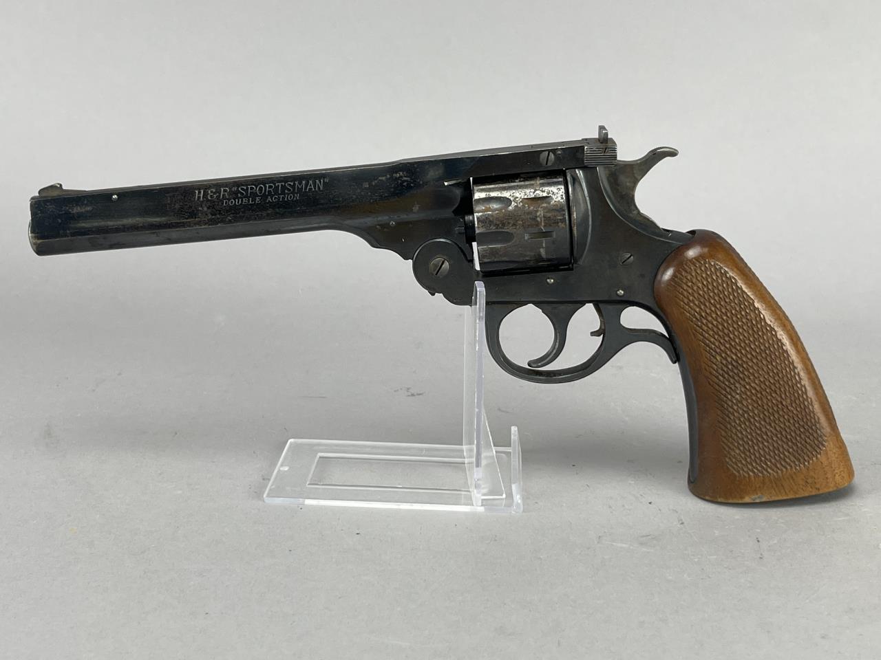 Harrington & Richardson Sportsman double-action revolver chambered in .22 LR. Serial number 80767. This revolver features a 6-inch barrel and an overall length of 10.75 inches. The firearm has a blued finish, checkered wooden grips, and a 9-shot cylinder. Front sight is a fixed blade, with an adjustable rear sight. Barrel markings indicate manufacturer address: ‘Harrington & Richardson Arms Co., Worcester, Mass., U.S.A.’