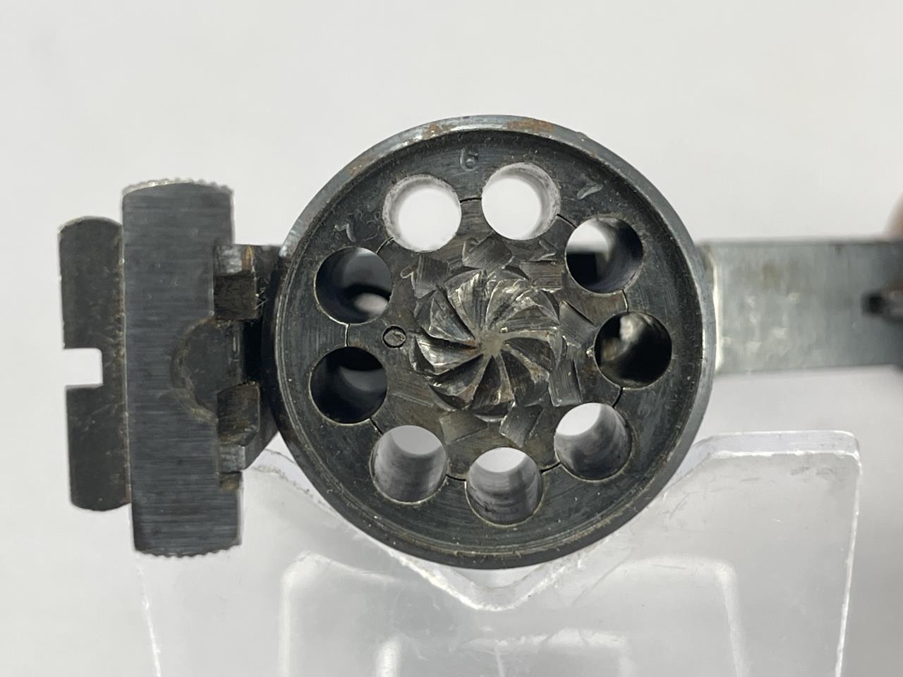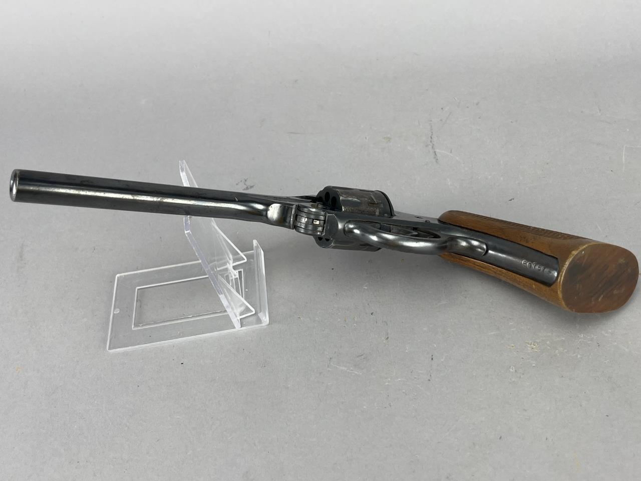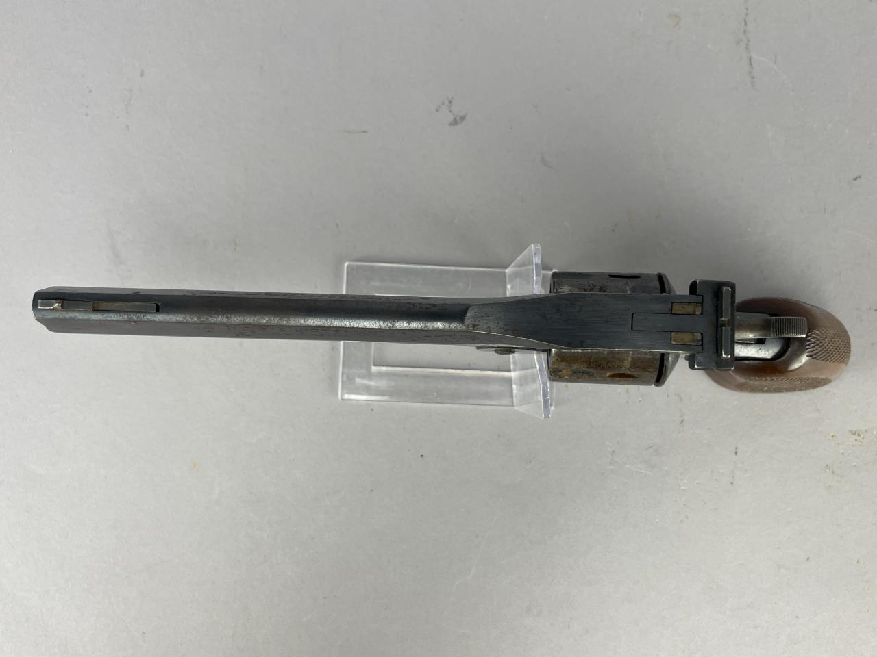 CONDITION: The revolver displays overall finish wear consistent with moderate use, with noticeable thinning, scratches, and spots of oxidation, particularly on the barrel, cylinder, and trigger guard. The bore is visible and shows defined rifling with some fouling present, potentially requiring cleaning. The wooden grips show wear to the checkering and small dings, particularly near the base. Mechanically, the trigger and hammer function under manual operation, and the cylinder rotates as expected. The finish around the grips and backstrap is notably worn.