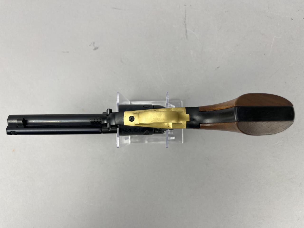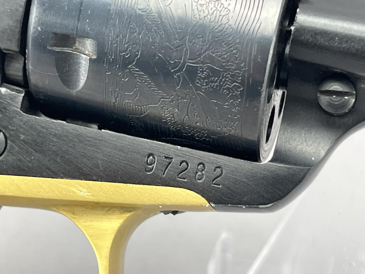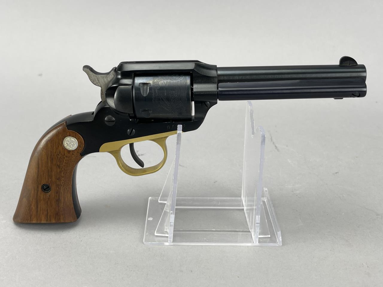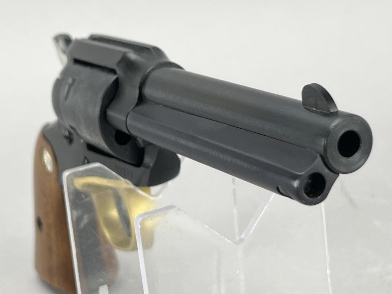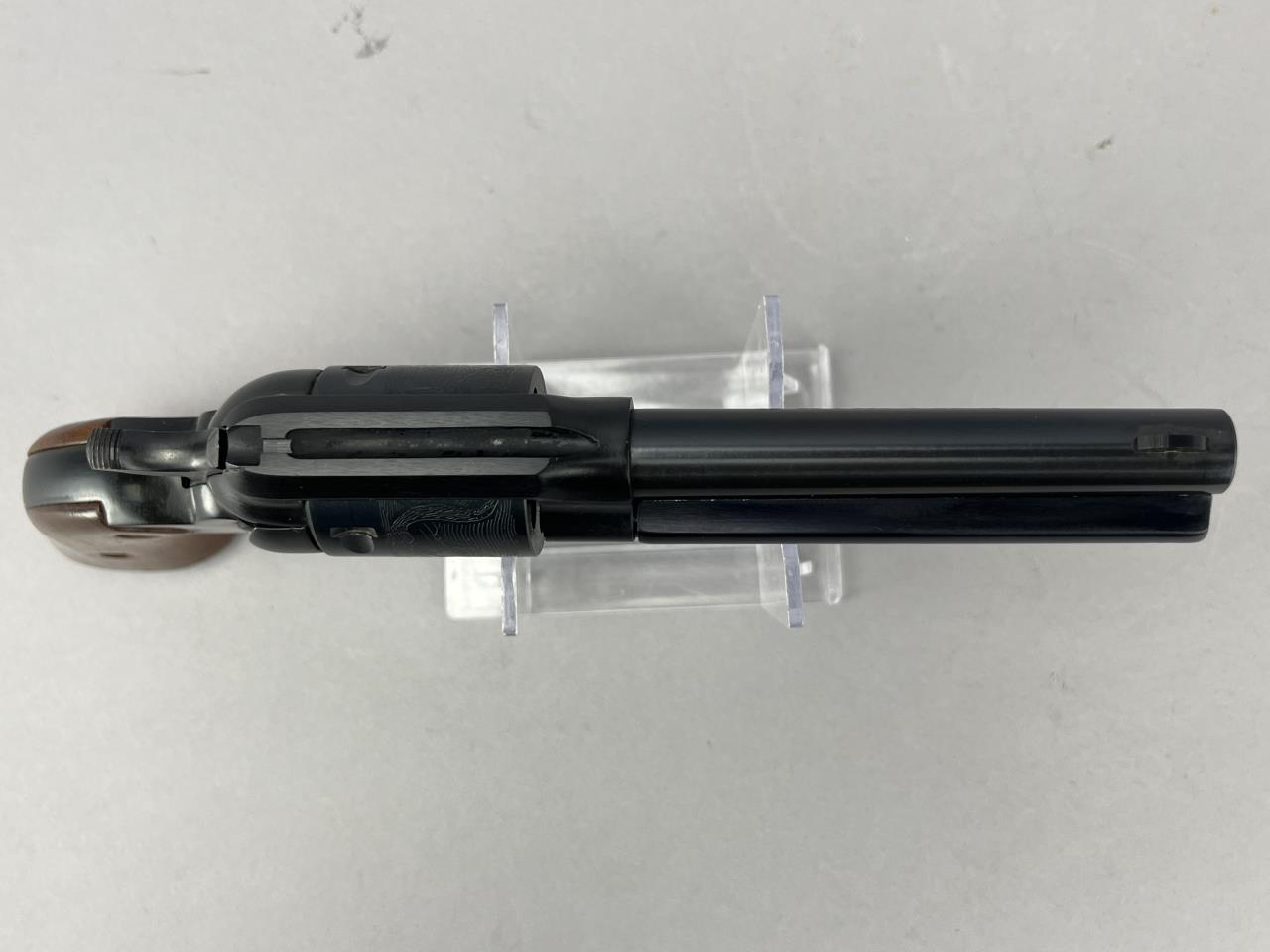 CONDITION: The revolver is in visually good condition, displaying light handling marks and minor finish wear on the blued surfaces, particularly near the cylinder and muzzle. The wood grips remain intact and exhibit minor surface wear, while the accompanying stag grips appear structurally sound with no visible cracks or chips. Mechanically, the cylinder rotates without binding, and the single-action trigger functions correctly, though internal inspection for precise assessment is not possible. Bore condition is not confirmed due to image limitations but appears visually clean. Gold-tone trigger guard shows minor scuffing. Overall, the firearm presents as well-maintained with typical signs of use.