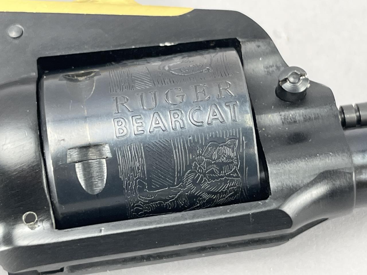 Ruger Bearcat .22 LR revolver, serial number 97282, featuring a 4-inch barrel and manufactured by Sturm, Ruger & Co. in Southport, Connecticut. This single-action revolver showcases an engraved cylinder with intricate tree and bear motifs, blued finish throughout, and a gold-tone trigger guard. The revolver is equipped with factory wood grips adorned with Ruger’s silver emblem and is accompanied by a pair of additional stag grips. Overall length measures approximately 9 inches. Background check required for purchase.