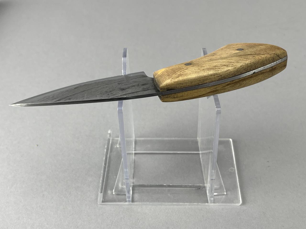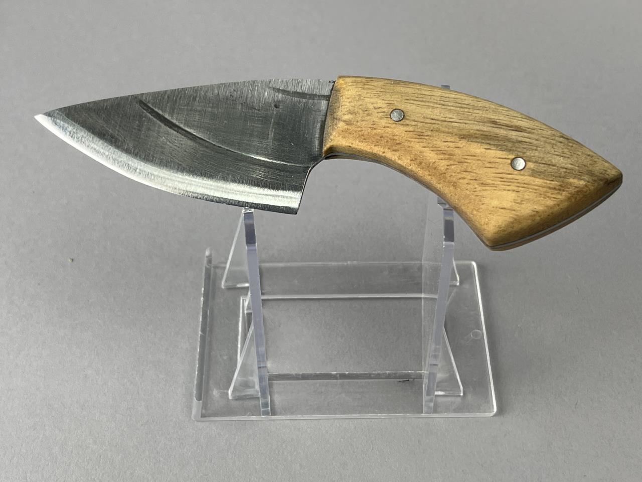 CONDITION: The blade displays light forging marks and faint discoloration consistent with handcrafted production processes and minimal handling wear. The Exotic Pine wood handle is smooth with minor natural grain variations and no visible cracks or chips. Rivets are securely intact. The knife appears structurally sound and fully functional.