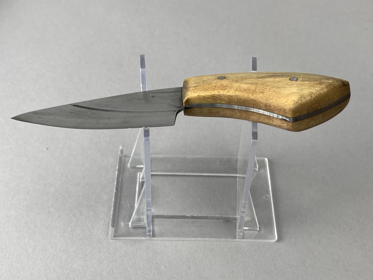 Hand-forged skinning knife locally crafted in Leslie, MI. This expertly handmade knife features a polished Exotic Pine wood handle, secured with dual rivets. The blade measures 3 inches in length while the overall knife measures 6 inches. The blade shows characteristic forging marks, indicative of its handcrafted nature.