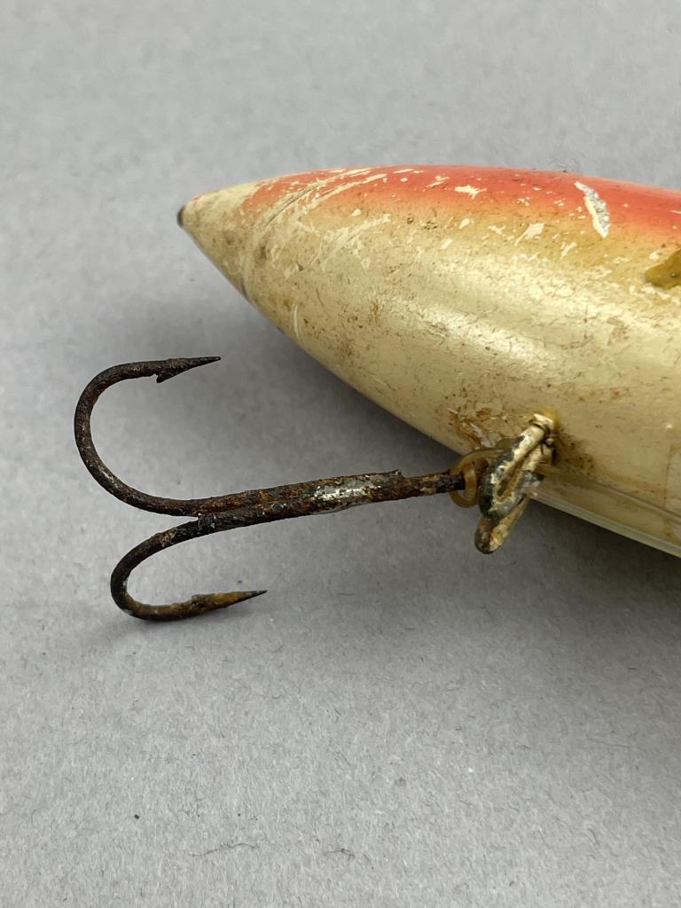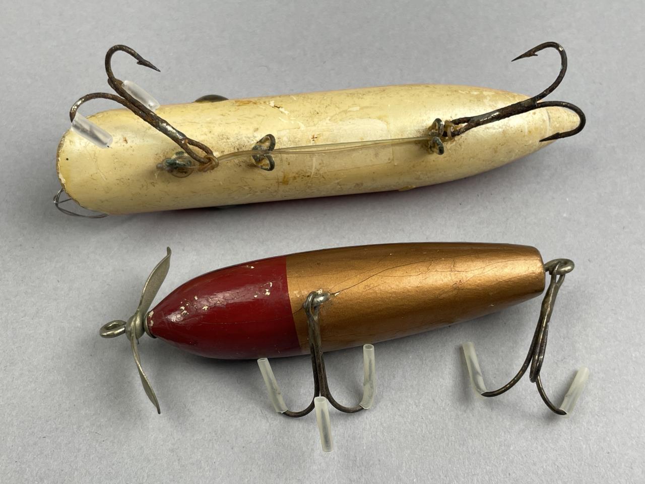 CONDITION: The lures show signs of age-appropriate wear, including chipped paint, scratches on the surfaces, and rust on the hooks. One treble hook on the cream-colored lure is broken, as visible in the provided images. The other hooks are intact but show rusting. The propeller on the red and gold lure is intact and functional.