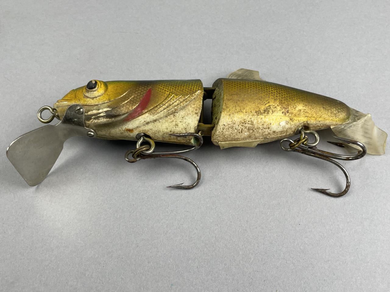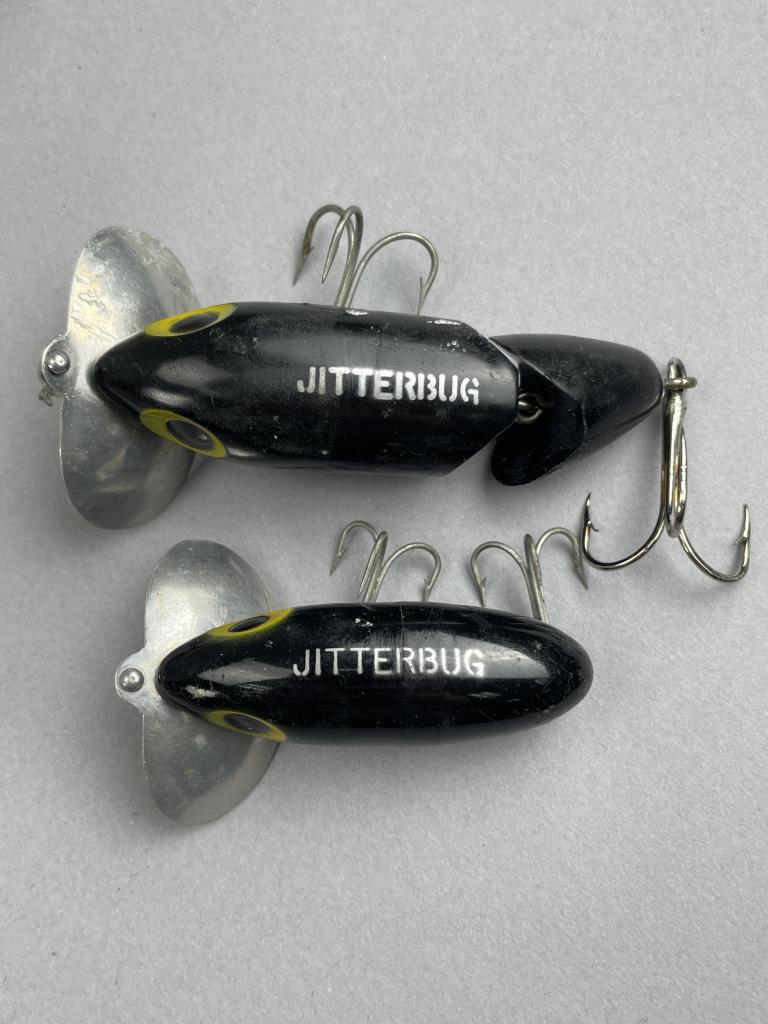 CONDITION: The lures display varying degrees of wear consistent with age and use. The Fred Arbogast Jitterbugs show light scratches and chipping in the paint. The South Bend ‘Hornet, SR’ lure exhibits notable surface crazing and paint loss, particularly in high-contact areas. The jointed lure displays surface wear, including discoloration and some minor oxidization on the metal components. The hooks and hardware on all lures show light rust and tarnish indicative of past exposure to water, but no structural damage is evident. Overall, this set remains a visually appealing collection of vintage lures suitable for display or continued use.