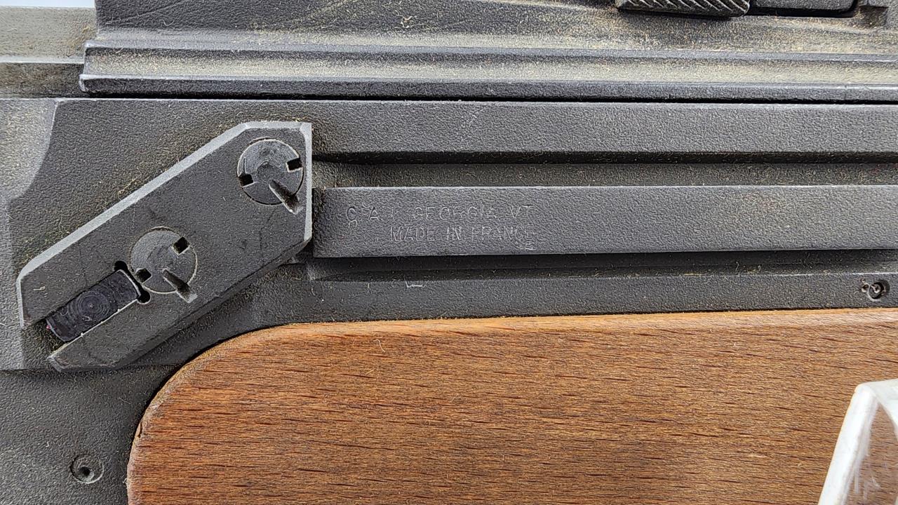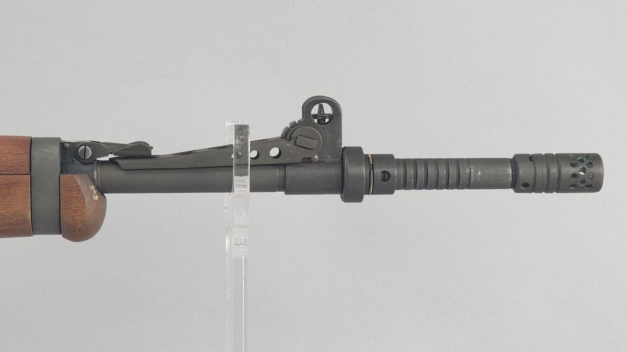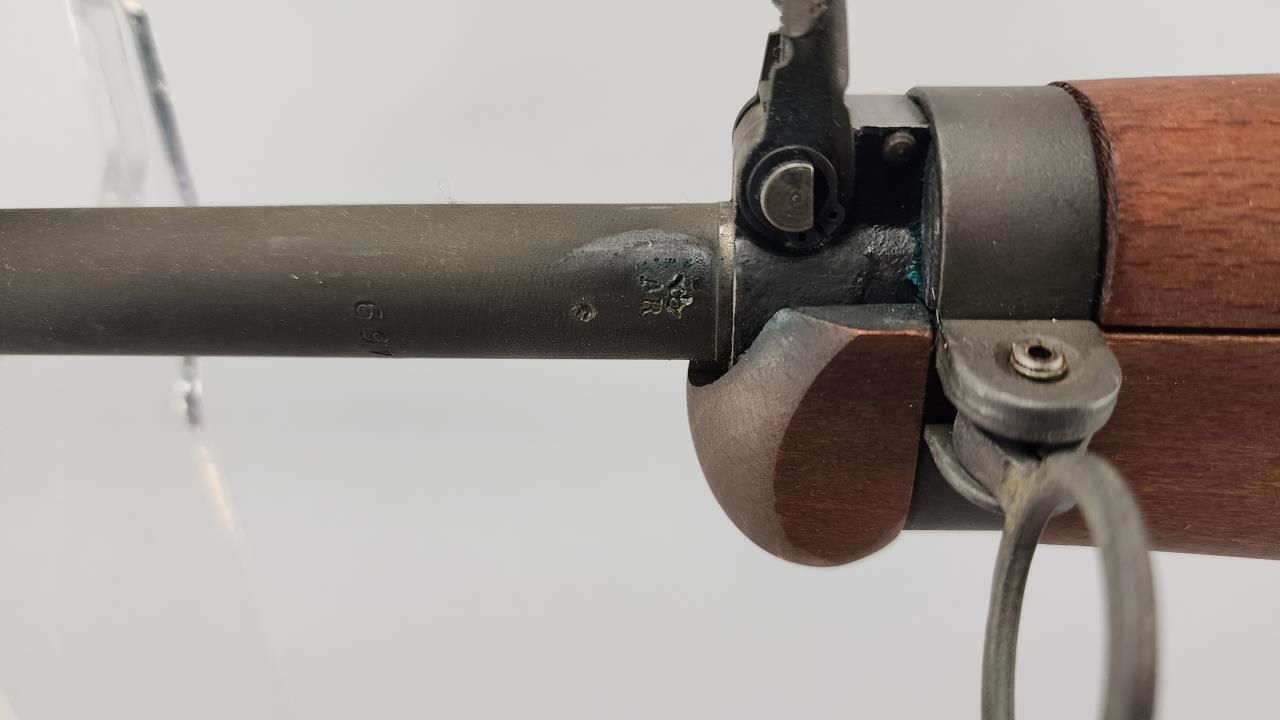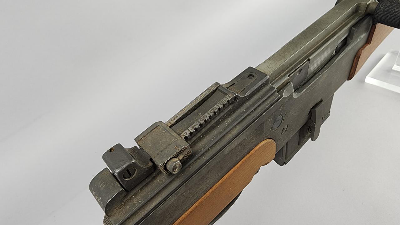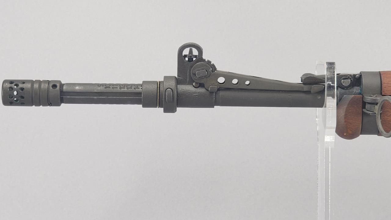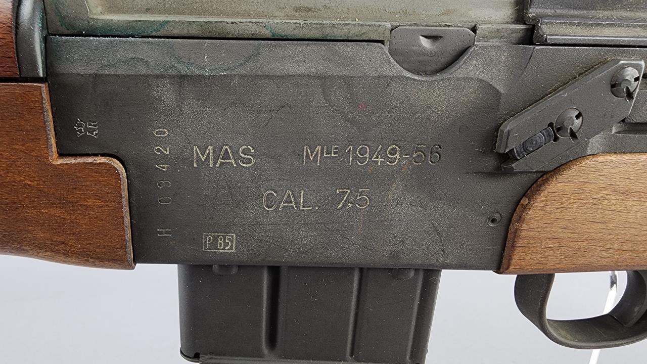 CONDITION: This MAS 1949-56 rifle shows signs of use, including light handling marks on the wood stock as visible in the images, particularly on the left side of the buttstock. The metal finish exhibits minor wear but retains overall uniformity. Some areas of discoloration or residue are present, particularly near the rear sight and muzzle device. The action functions smoothly upon manual operation. Bore condition appears clean and retains clear rifling. All observed parts appear intact with no visible repairs or modifications.