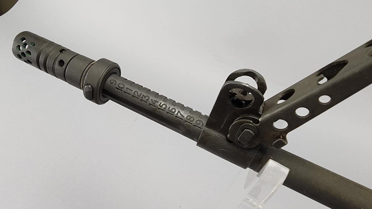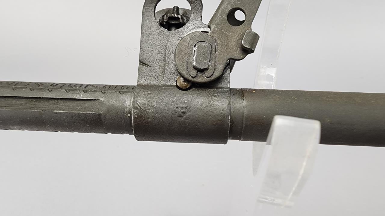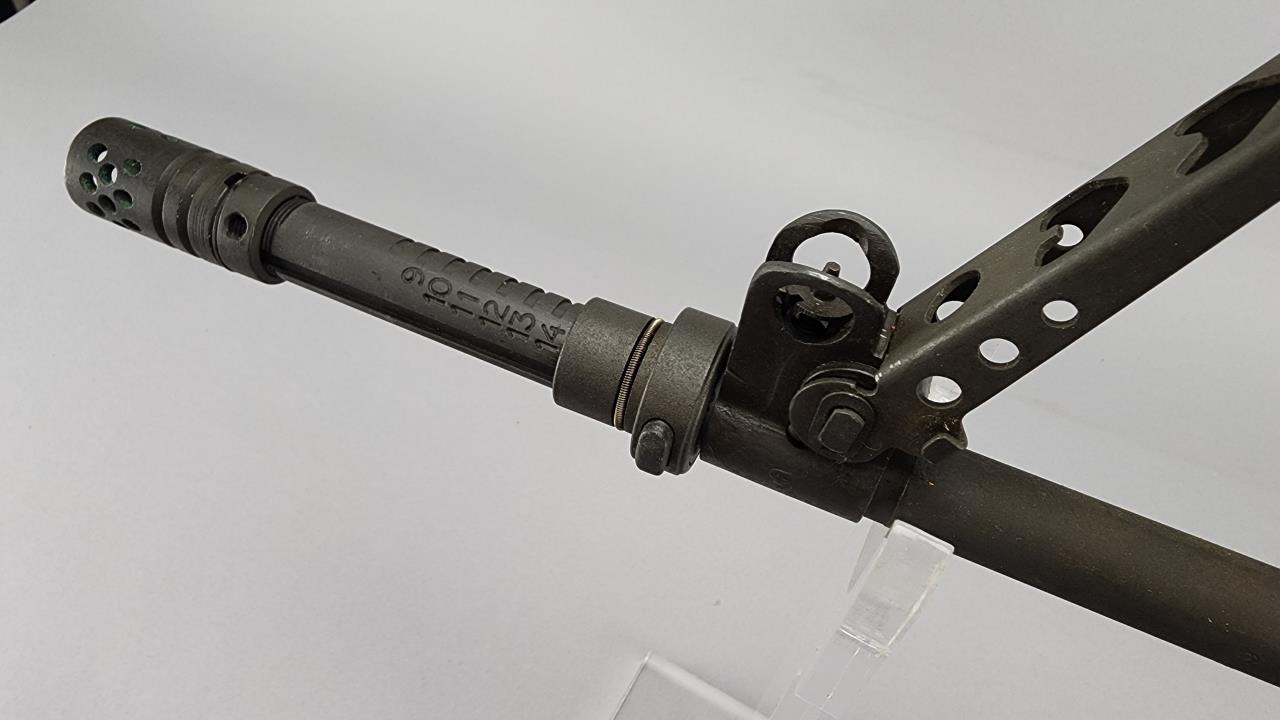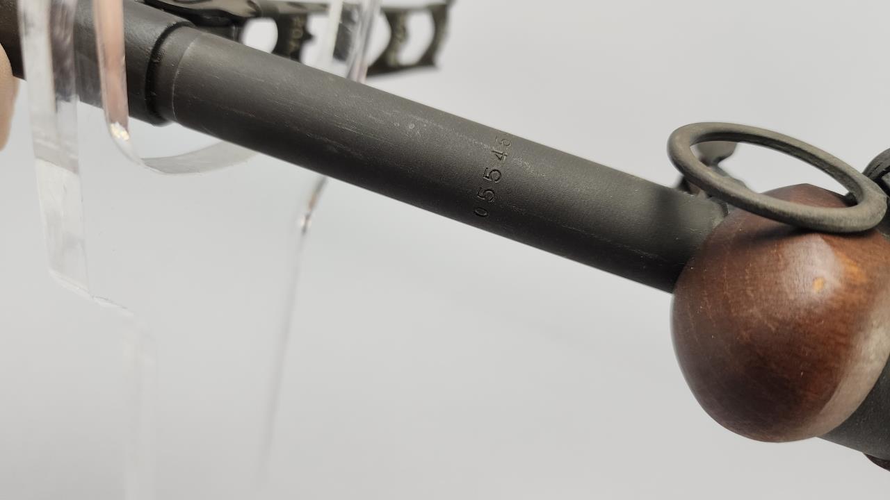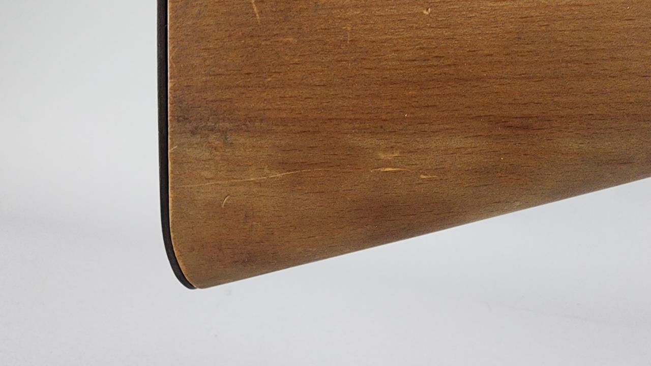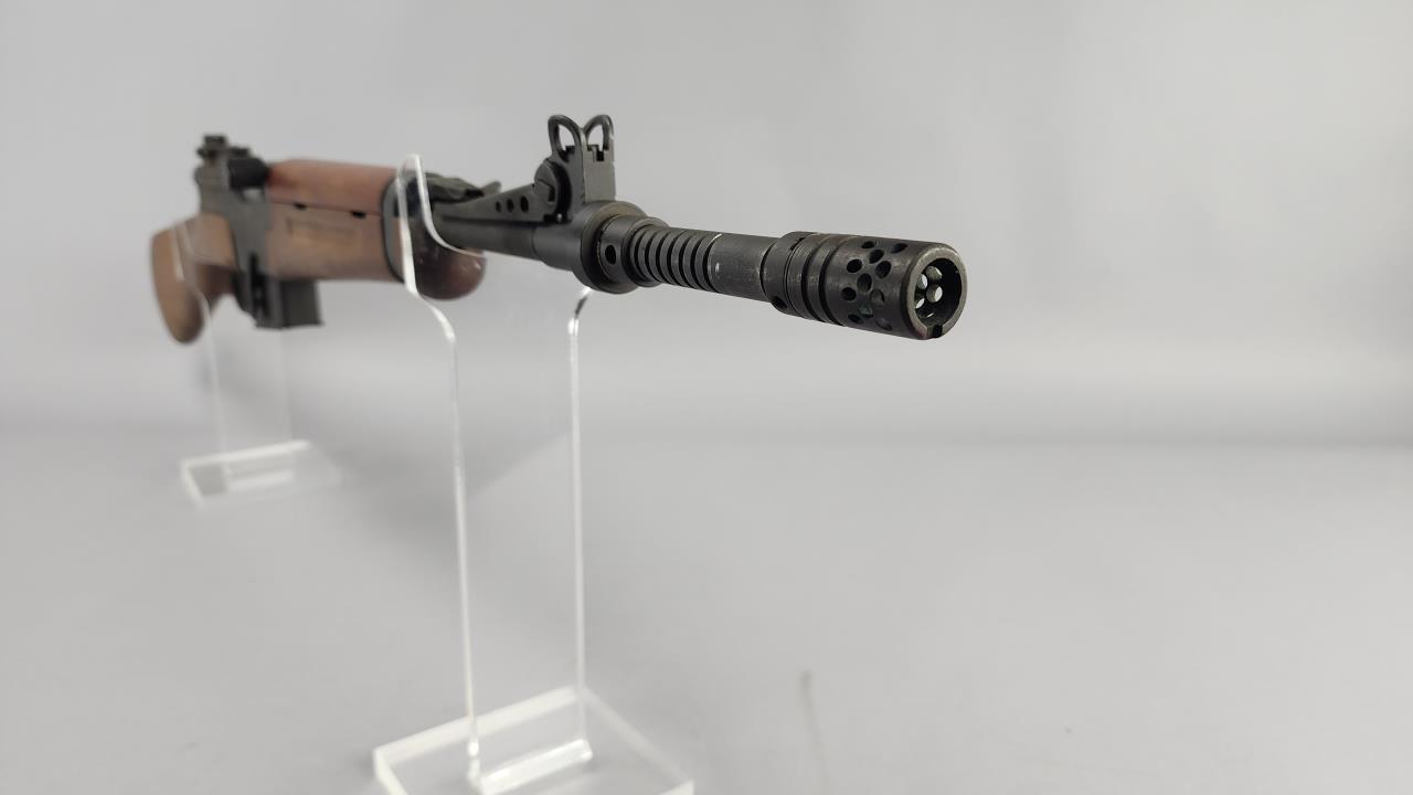 CONDITION: This MAS 1949-56 rifle shows signs of use, including light handling marks on the wood stock as visible in the images, particularly on the left side of the buttstock. The metal finish exhibits minor wear but retains overall uniformity. Some areas of discoloration or residue are present, particularly near the rear sight and muzzle device. The action functions smoothly upon manual operation. Bore condition appears clean and retains clear rifling. All observed parts appear intact with no visible repairs or modifications.