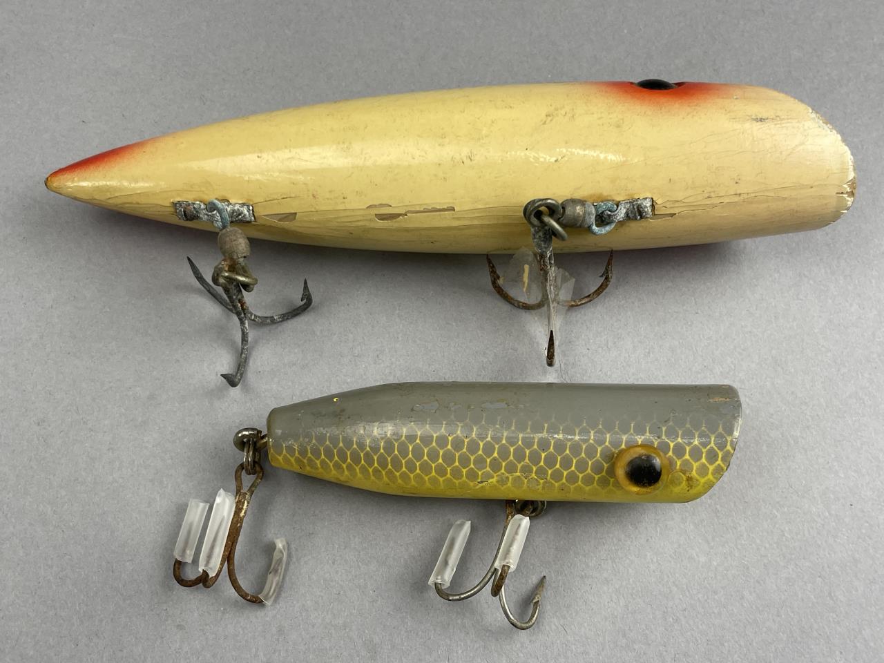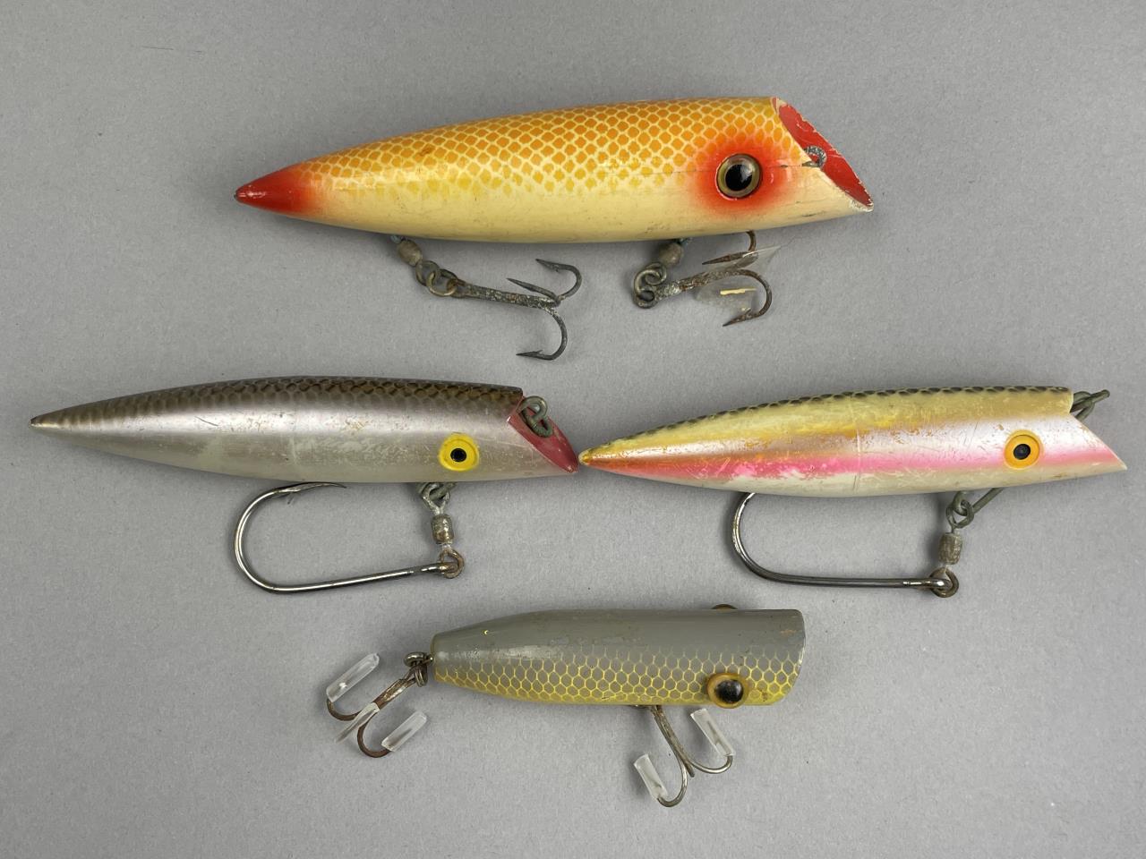 CONDITION: The lures exhibit varying degrees of wear consistent with age and use. Paint loss, scratches, and finish wear are evident on multiple lures. Hardware components, including hooks and connectors, show surface rust and patina, with some hooks retaining protective covers. One lure displays more significant paint chipping near the tail. Condition as a whole aligns with expected vintage use, though restoration or cleaning may be required depending on display or practical use preferences.
