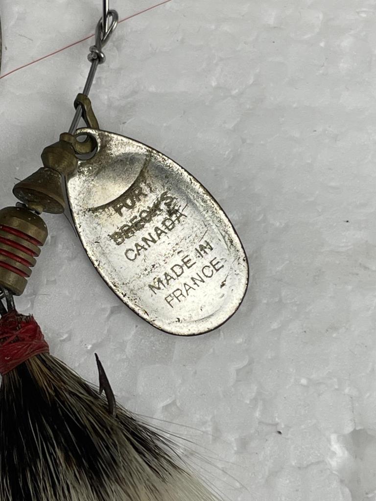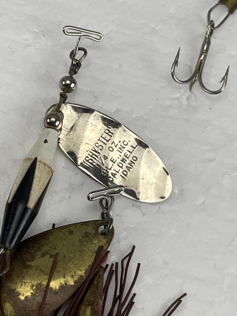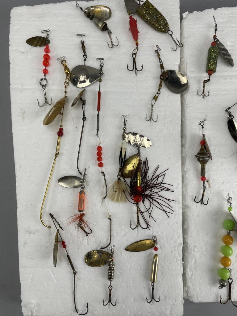 CONDITION: All lures display signs of wear consistent with use and age, including minor surface rust on hooks, wear to finishes, and tarnishing. The beaded accents and hair components are intact but show some fraying and aging. A few spinner blades have scratches and signs of corrosion, though all appear structurally sound and functional. Markings on certain lures are legible but show faintness due to wear. This varied collection is incomplete with no original packaging included.