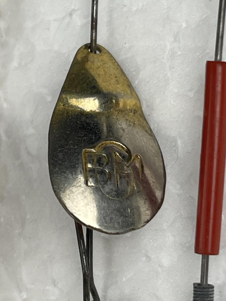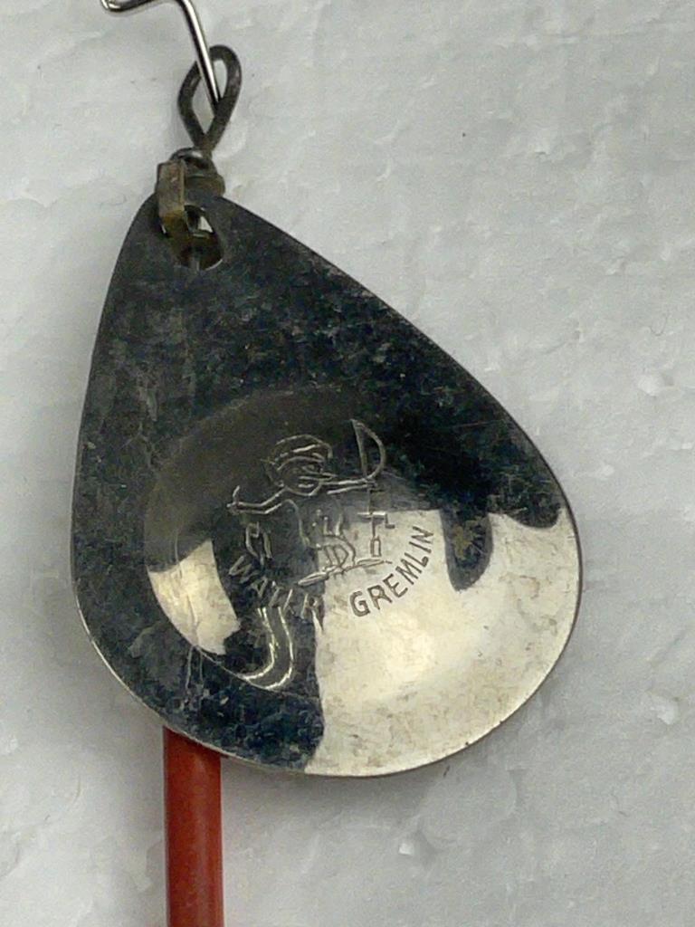 A collection of 22 fishing lures featuring a variety of designs, colorful beading, and hair or rubber accents. This mix includes multiple spinner lures, some marked with identifiable brand names such as Mepps (Made in France), Fishmaster (Made in Idaho, USA), and Gremlin. Several pieces exhibit stamped maker’s marks and design details, including engraved initials or patterns. The lures show a combination of brass- and chrome-toned finishes, with visible signs of use such as surface wear, tarnishing, and minor rusting on the hooks. Noteworthy decorative and functional features include treble hooks, bead accents, and brightly painted or hair-enhanced spinners for improved water visibility.