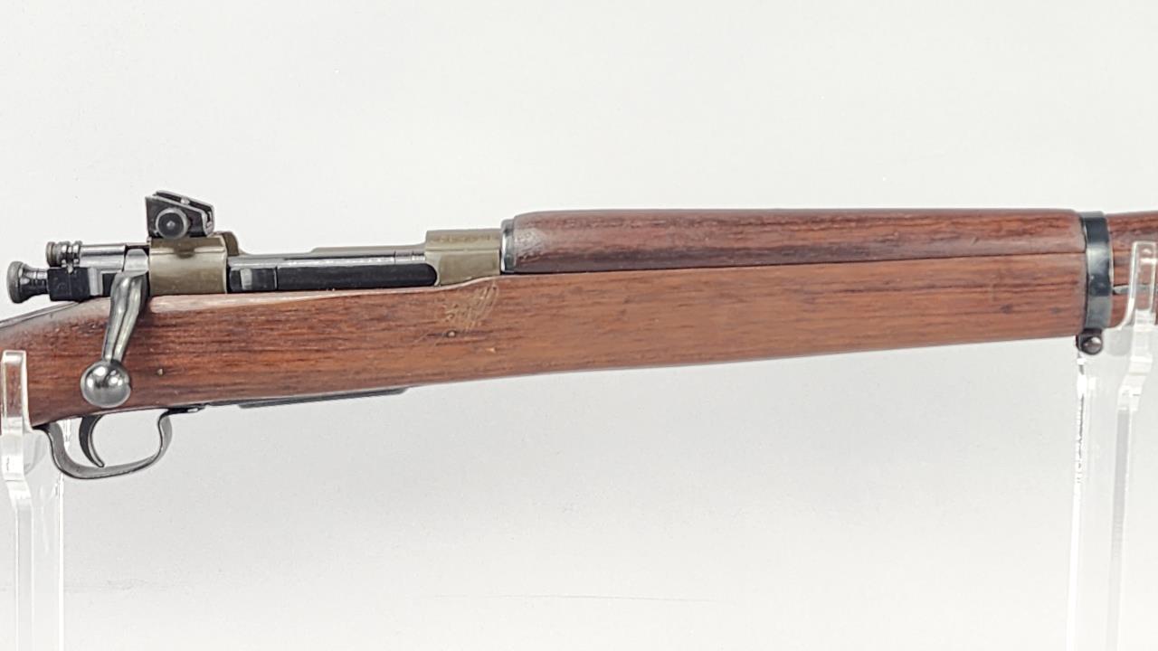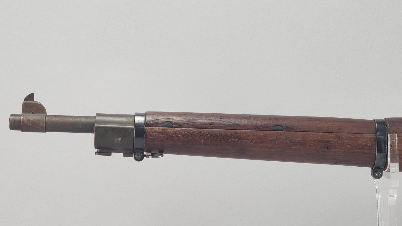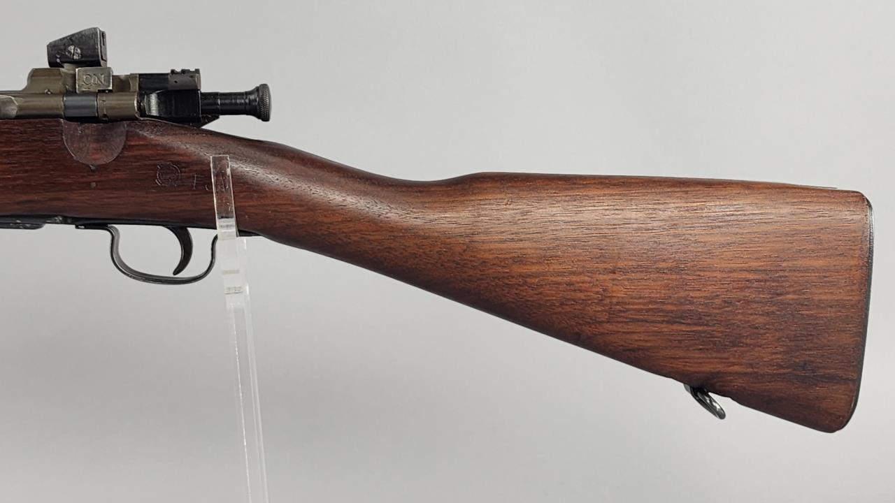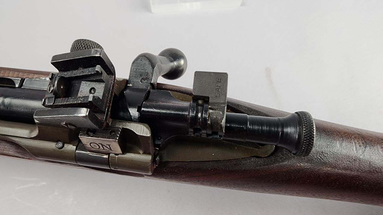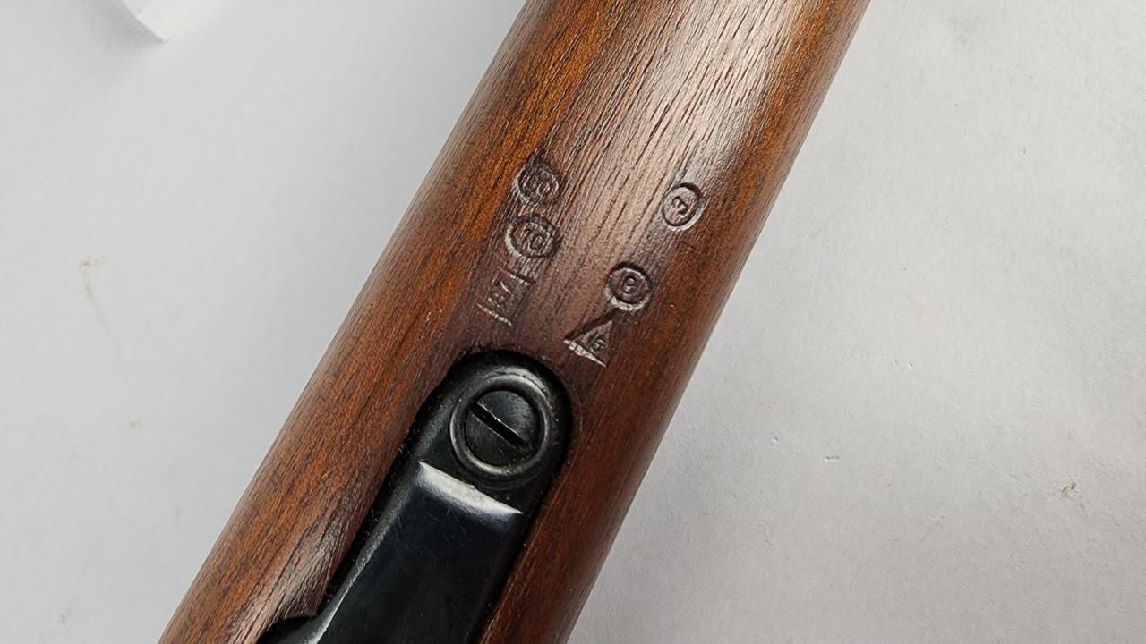 CONDITION: The rifle exhibits moderate handling wear but appears overall intact. The parkerized finish shows minor thinning and wear on high-contact areas. The walnut stock has visible handling marks and scratches along with clear cartouche marks but remains solid and free of cracks. The bore appears bright with strong rifling visible. The bolt cycles smoothly, and the safety engages properly. The barrel bands, sight components, and metal fittings are securely mounted with no signs of significant damage.
