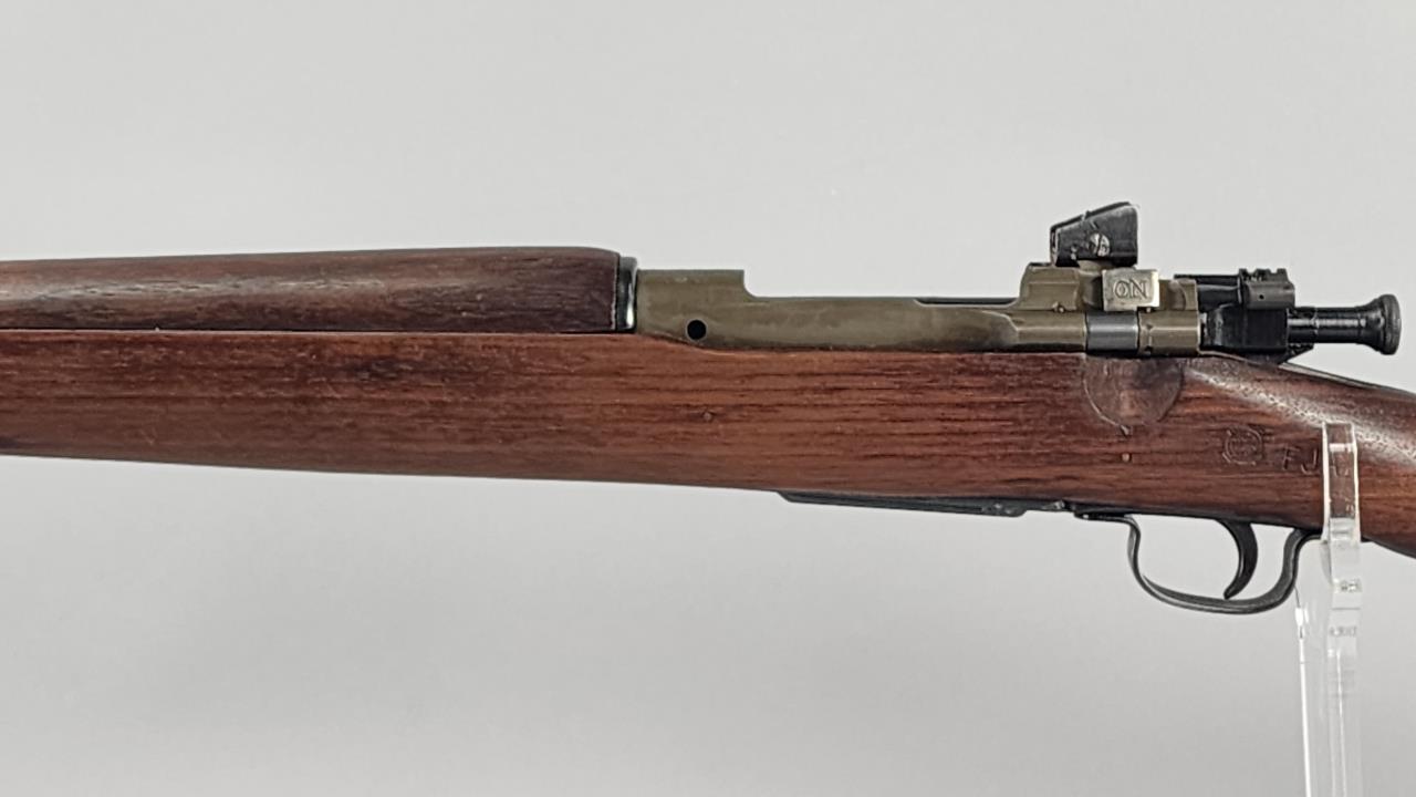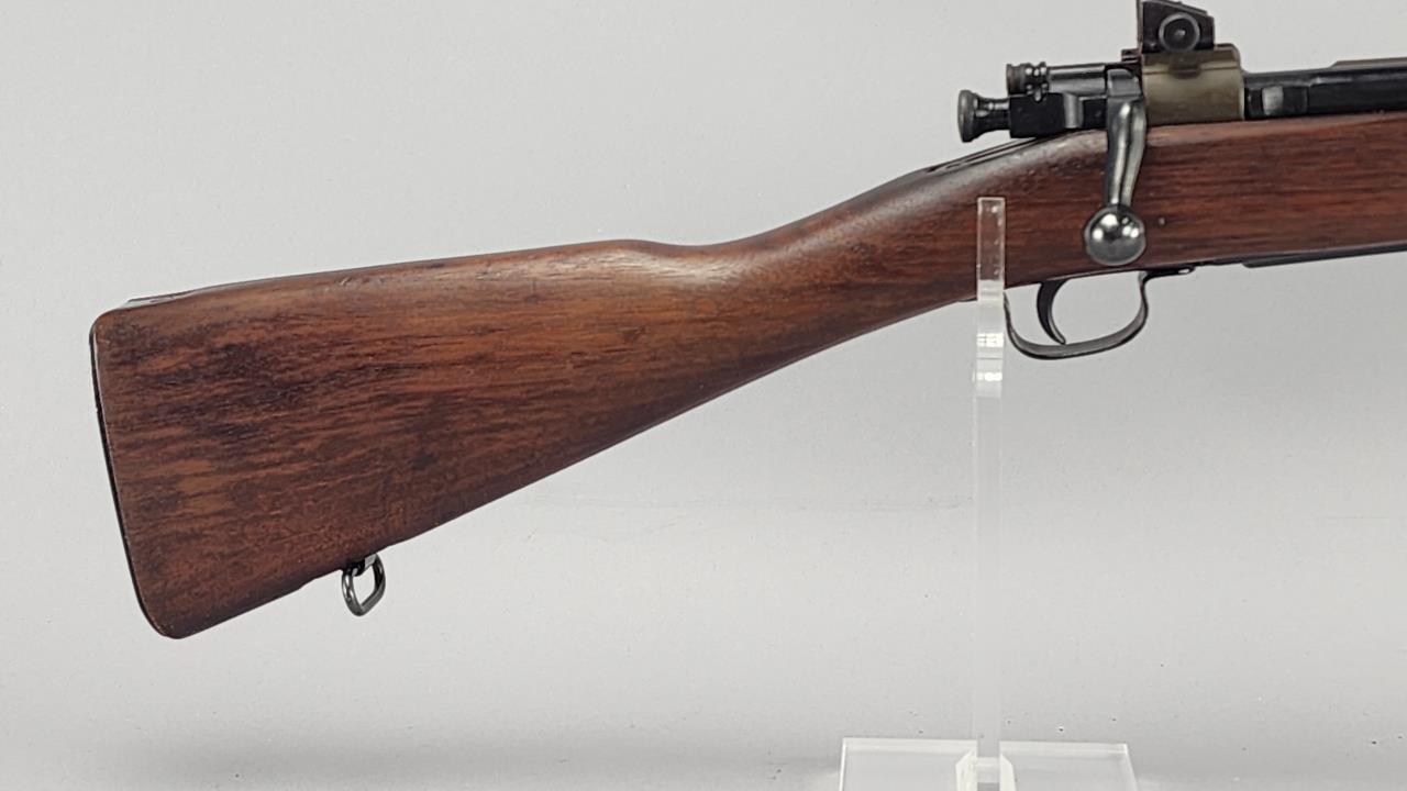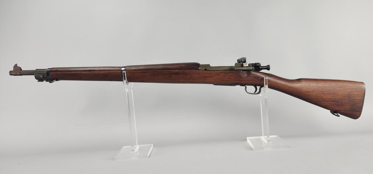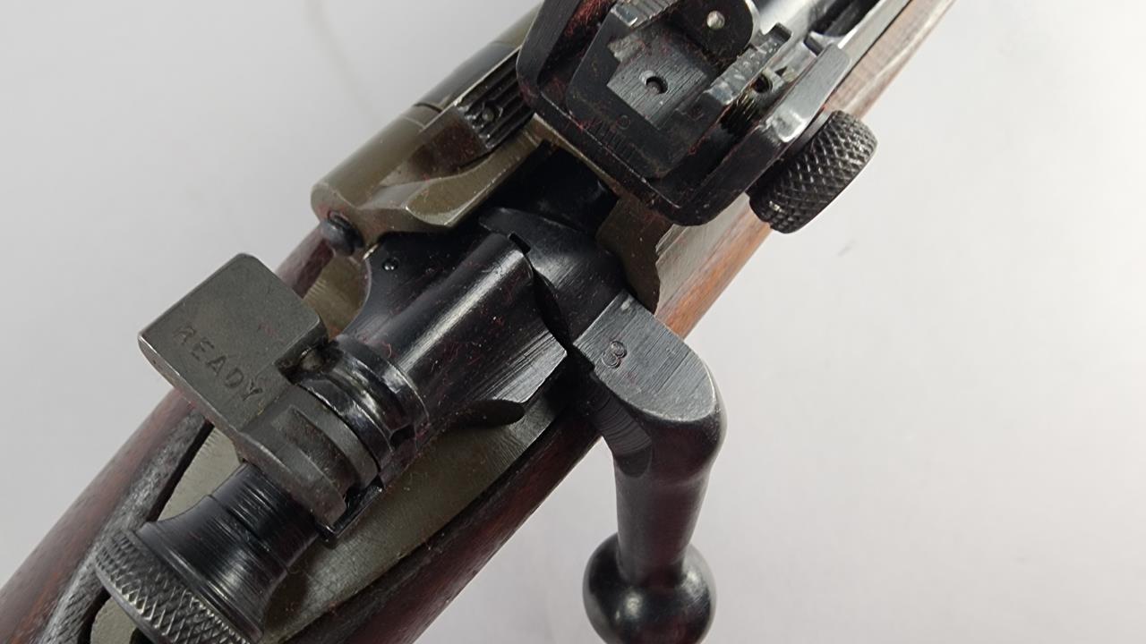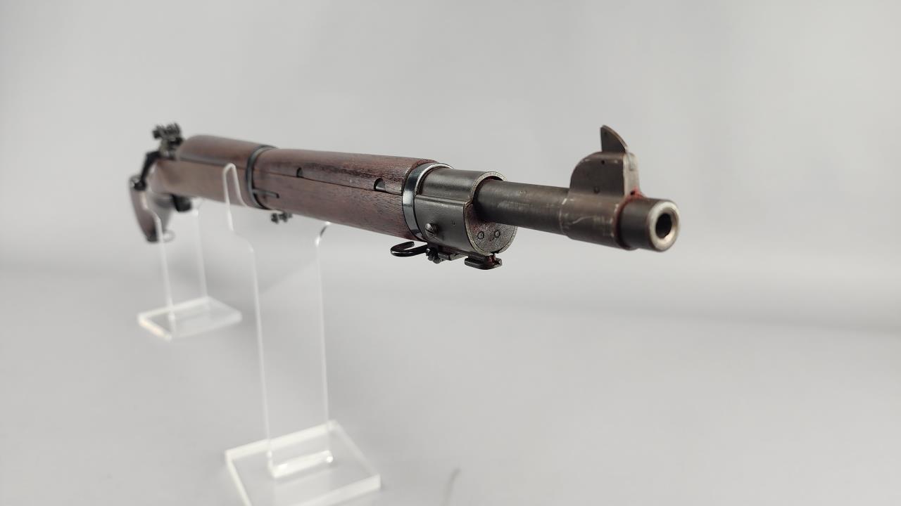 CONDITION: The rifle exhibits moderate handling wear but appears overall intact. The parkerized finish shows minor thinning and wear on high-contact areas. The walnut stock has visible handling marks and scratches along with clear cartouche marks but remains solid and free of cracks. The bore appears bright with strong rifling visible. The bolt cycles smoothly, and the safety engages properly. The barrel bands, sight components, and metal fittings are securely mounted with no signs of significant damage.