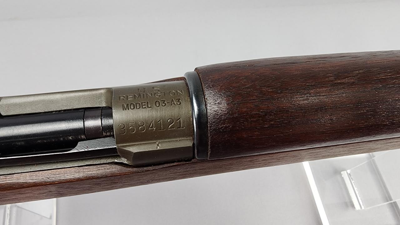 Remington Model 1903-A3 bolt-action rifle chambered in .30-06 Springfield. Serial number 3584121. The barrel measures 24 inches in length, and the receiver and barrel display proper markings, with the barrel marked ‘R.A.’ over a flaming bomb and dated ‘3-43.’ The military-style stock is marked with ‘FJA’ and other inspector’s cartouches, indicative of U.S. military inspection. The rifle features a parkerized finish on the metal components and a walnut stock with handguard. Standard military-style front blade sight with protective ears and an adjustable rear aperture sight are present. The buttplate features a trapdoor for cleaning kit storage.