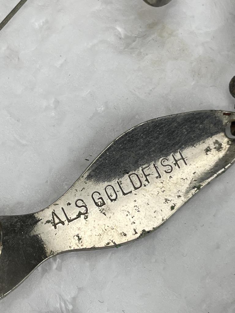 CONDITION: Overall condition shows visible wear consistent with use, including tarnish, scuffs, and oxidation on some metal surfaces. Hooks demonstrate signs of rust and age-related patina. The animal hair adornments exhibit fraying and discoloration. No missing parts noted, and the majority of lures remain structurally intact with markings clear where present.
