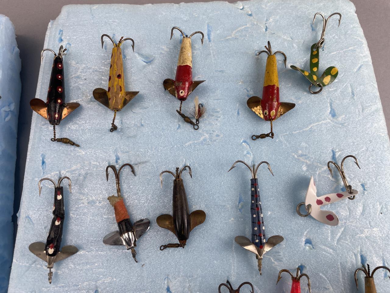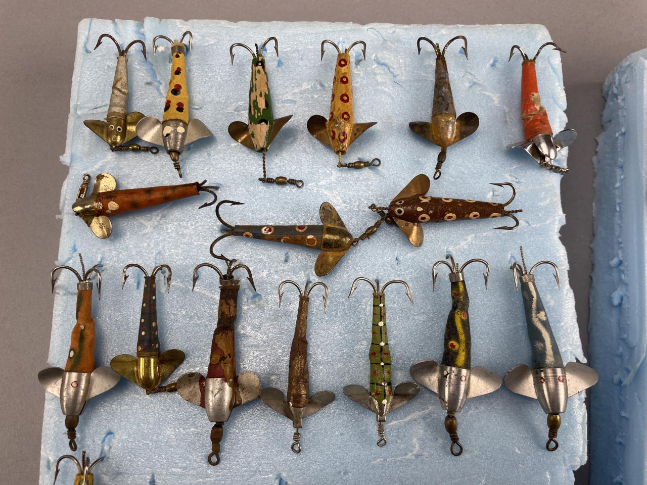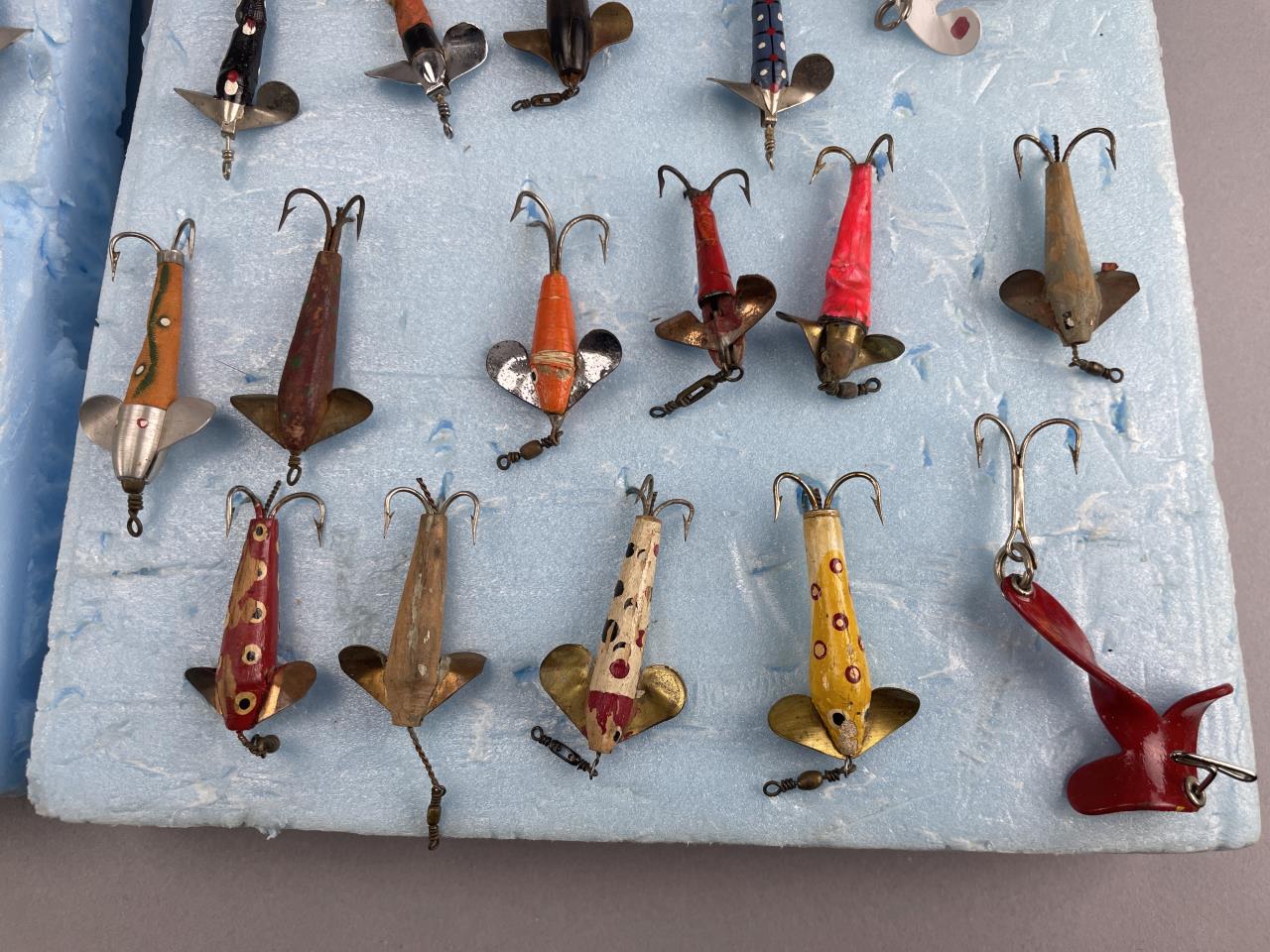 CONDITION: The lures display visible wear consistent with use and age, including flaking paint, scratches, and varying degrees of surface corrosion on metal components. Some hooks show signs of rust, and certain lures exhibit chipped or worn finishes. No significant structural damage is evident, and all propellers/wings appear intact. Overall wear adds to the vintage character but confirms previous usage. Buyers are encouraged to examine the images closely.