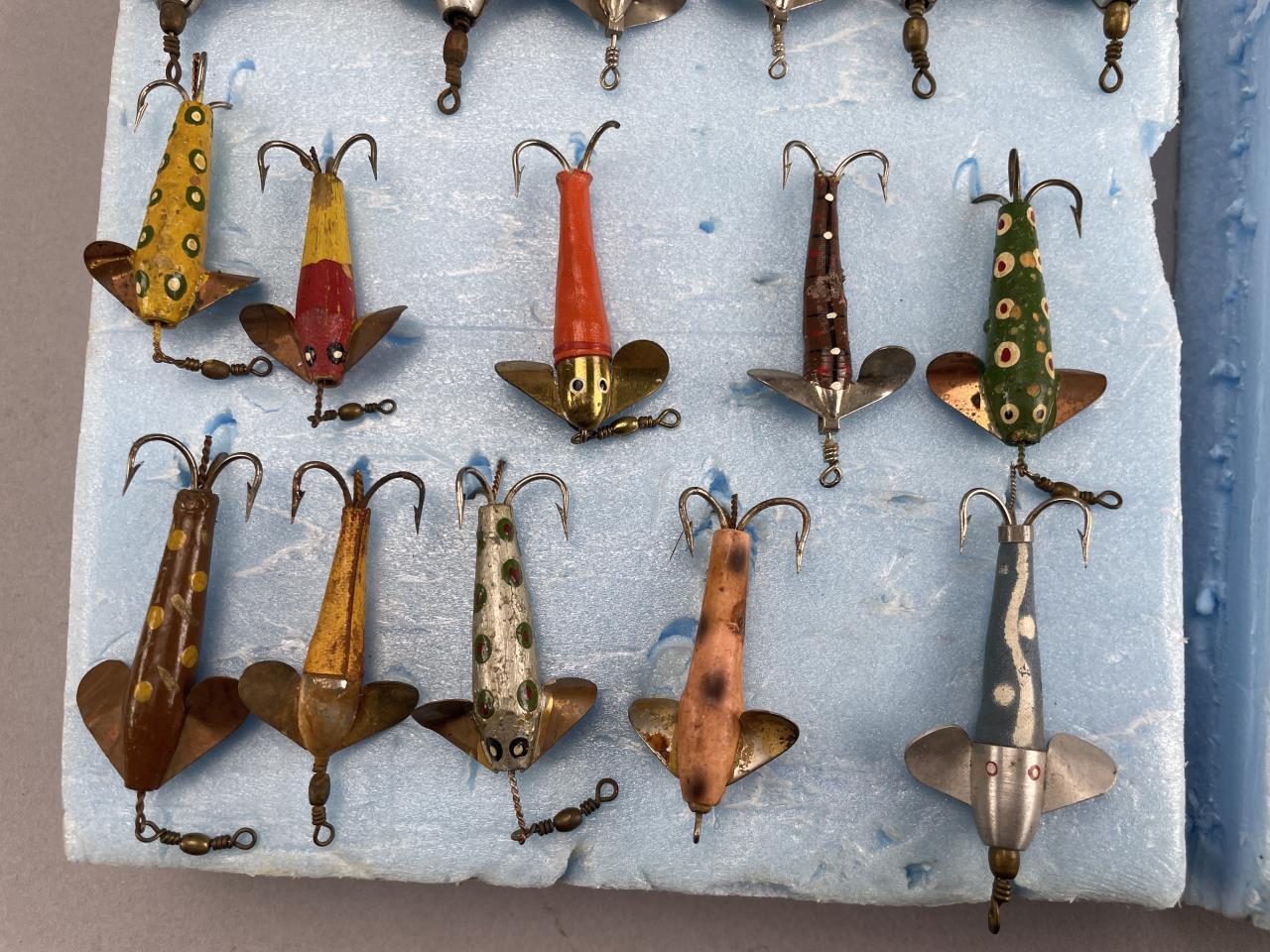 A collection of 47 vintage fly rod fishing lures made from both wood and plastic materials. These lures feature various designs and color patterns, including polka dots, stripes, and painted finishes. Each lure is equipped with metal hooks and propellers or wings for enhanced functionality and appeal. No manufacturer markings are visible on the items. This assortment offers a broad range of collectible designs suitable for vintage tackle enthusiasts.