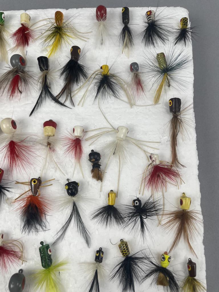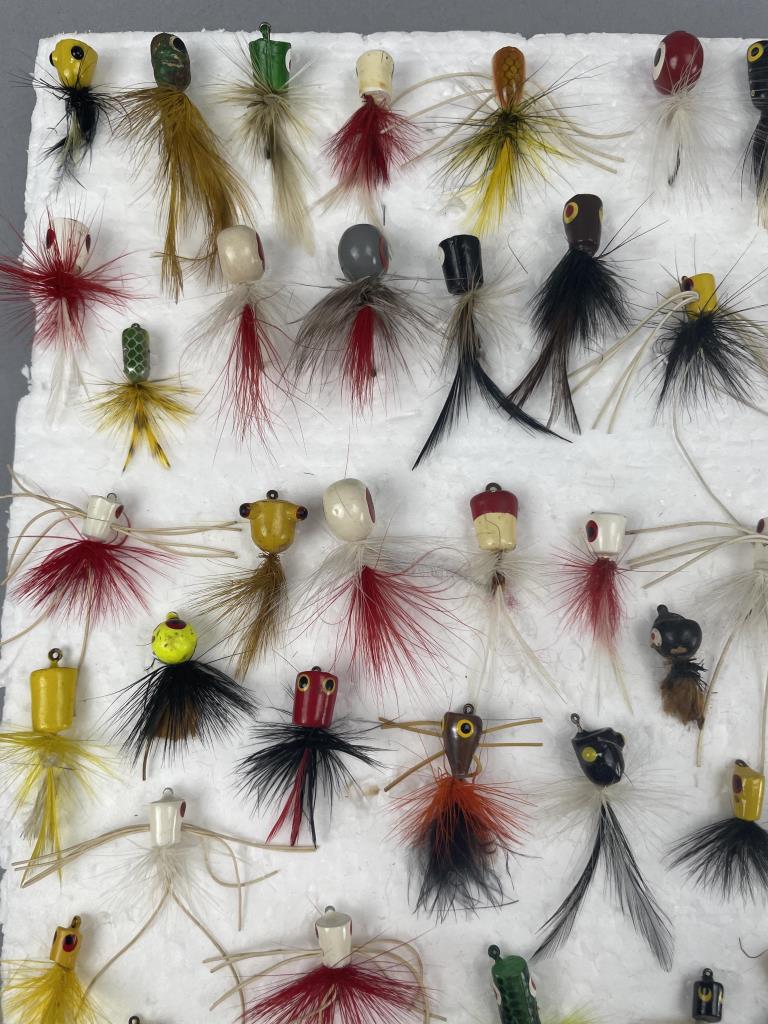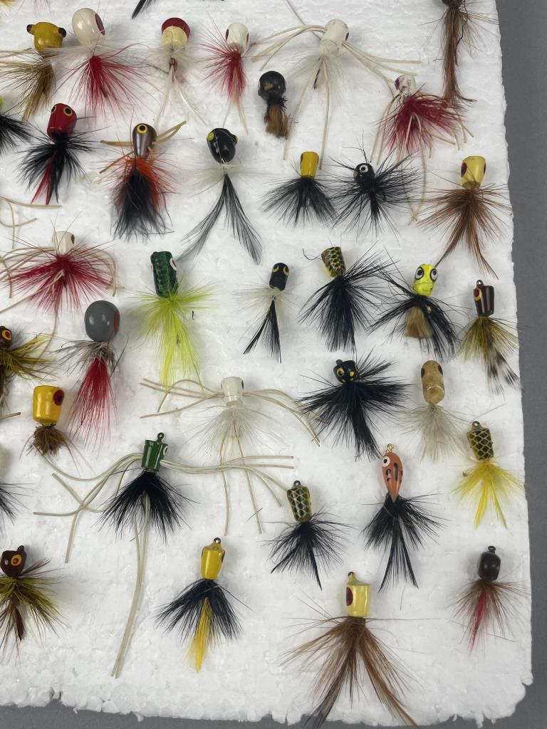 Lot of over 62 small handcrafted fishing lures, each adorned with painted bodies and hair or feather details. These lures exhibit a variety of colors, finishes, and designs, including frog patterns, solid hues, and eye embellishments. Constructed primarily for fly or topwater fishing, they lack any visible maker’s marks or manufacturing stamps. The assortment includes numerous compact styles, with most lures featuring rubber appendages and intricately detailed featherwork designed to attract fish.