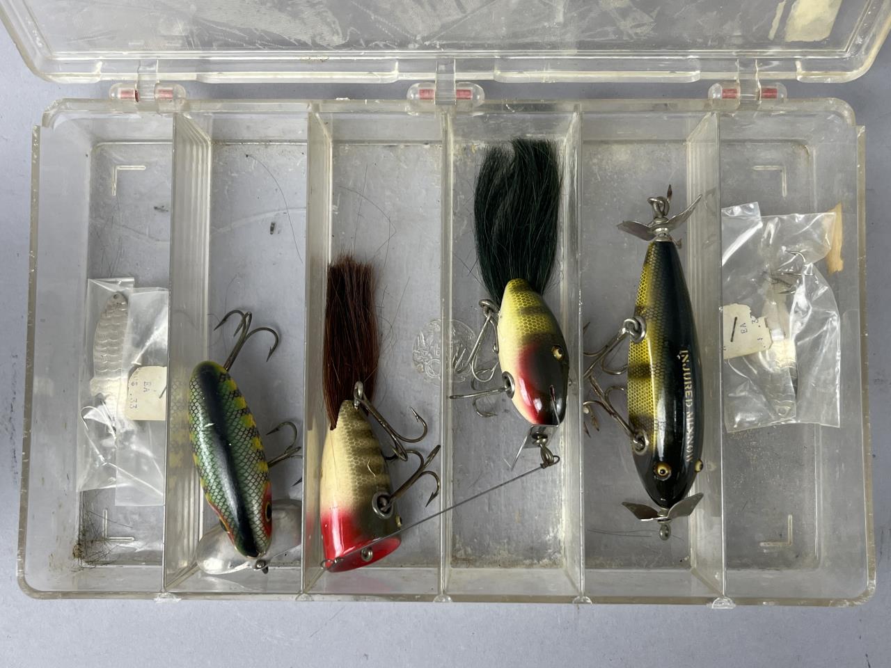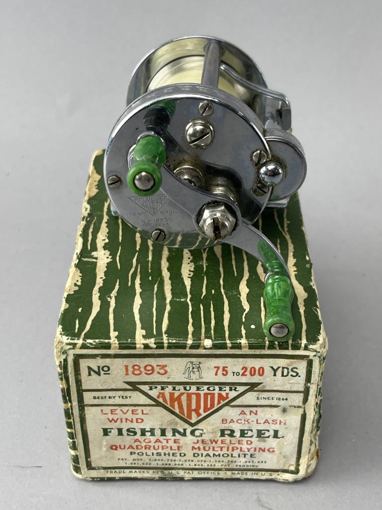 CONDITION: The Pflueger Akron reel is in fair condition with visible surface wear and some pitting on the finish, consistent with use and age. The original box shows wear and fraying edges but is intact with legible labeling. The six fishing lures exhibit varying degrees of wear, including paint loss, scratches, and corrosion on some hooks. The plastic tackle box shows scuffs, scratches, and slight discoloration but remains functional with intact compartments.