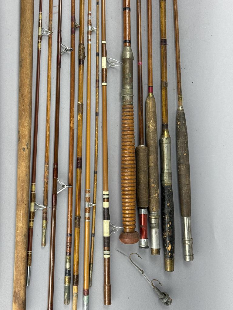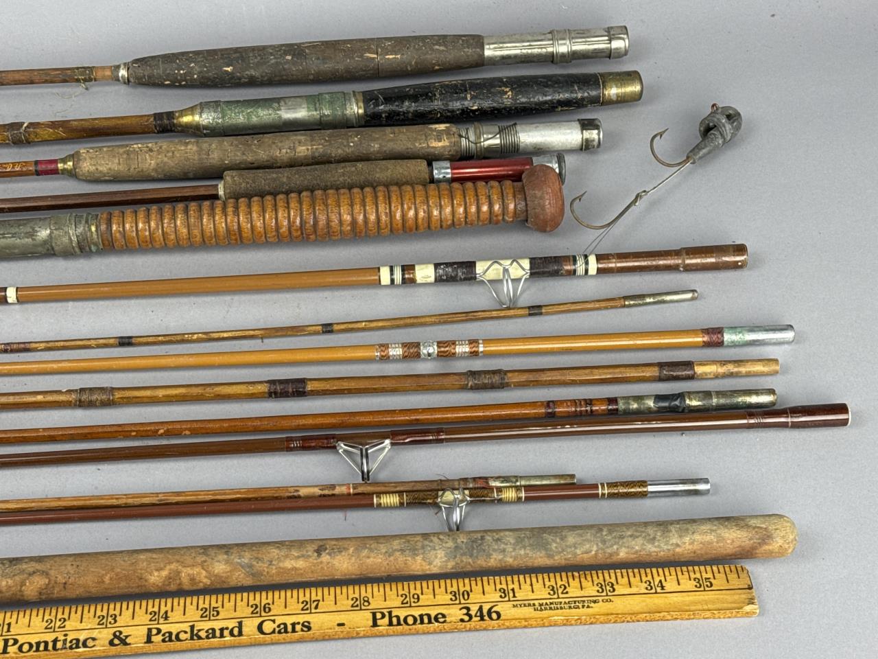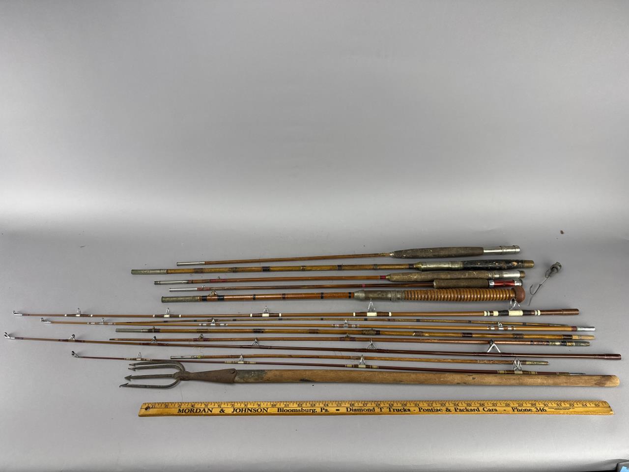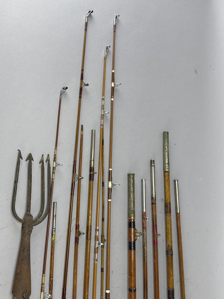 CONDITION: The rods exhibit varying levels of wear consistent with age and use. Cork handles show signs of handling, some with surface cracking or discoloration. Metal handles display abrasions and patina. Rod finishes reveal scratches, areas of fading, and loss of lacquer on some pieces. Guides are generally intact, with some thread bindings showing fraying or loosening. The wooden spear has a worn handle and surface corrosion on the trident head. Overall, this lot is in used vintage condition and would benefit from cleaning and potential restoration.