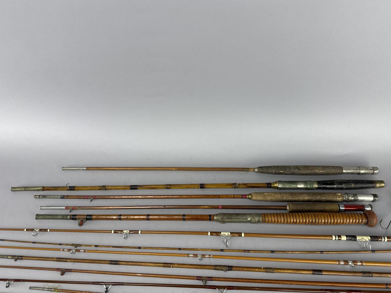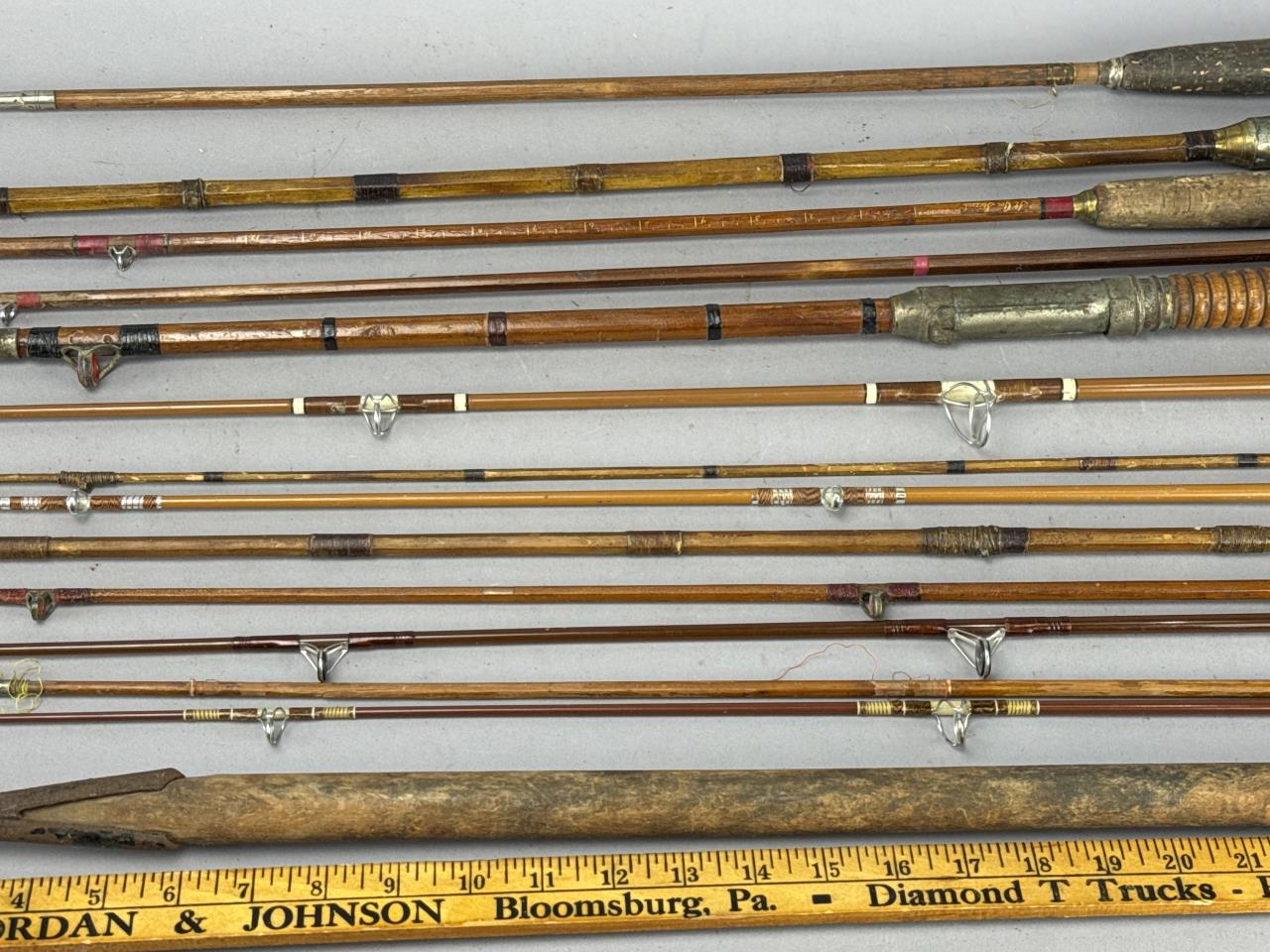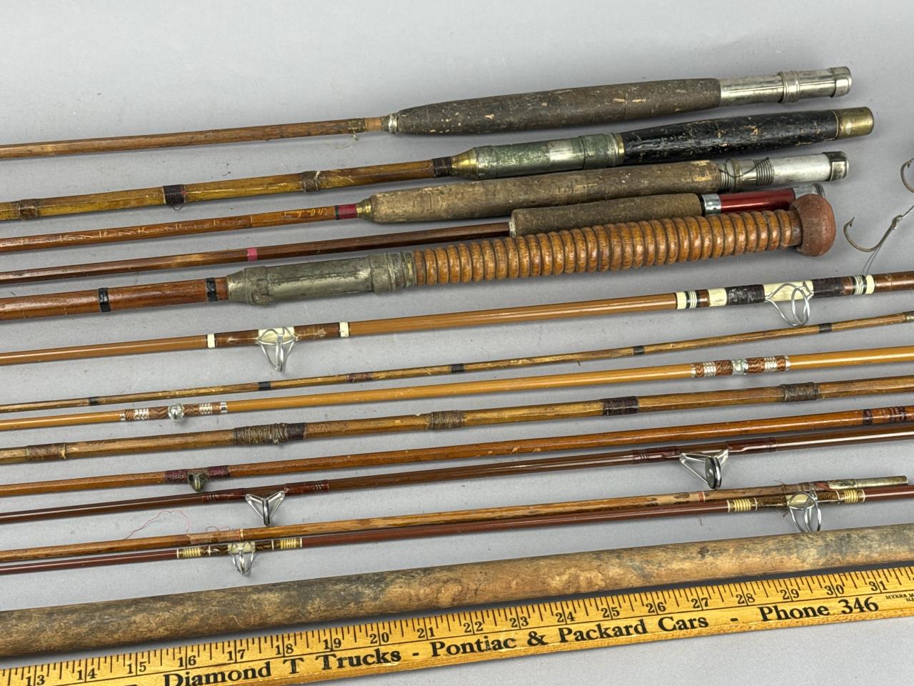CONDITION: The rods exhibit varying levels of wear consistent with age and use. Cork handles show signs of handling, some with surface cracking or discoloration. Metal handles display abrasions and patina. Rod finishes reveal scratches, areas of fading, and loss of lacquer on some pieces. Guides are generally intact, with some thread bindings showing fraying or loosening. The wooden spear has a worn handle and surface corrosion on the trident head. Overall, this lot is in used vintage condition and would benefit from cleaning and potential restoration.