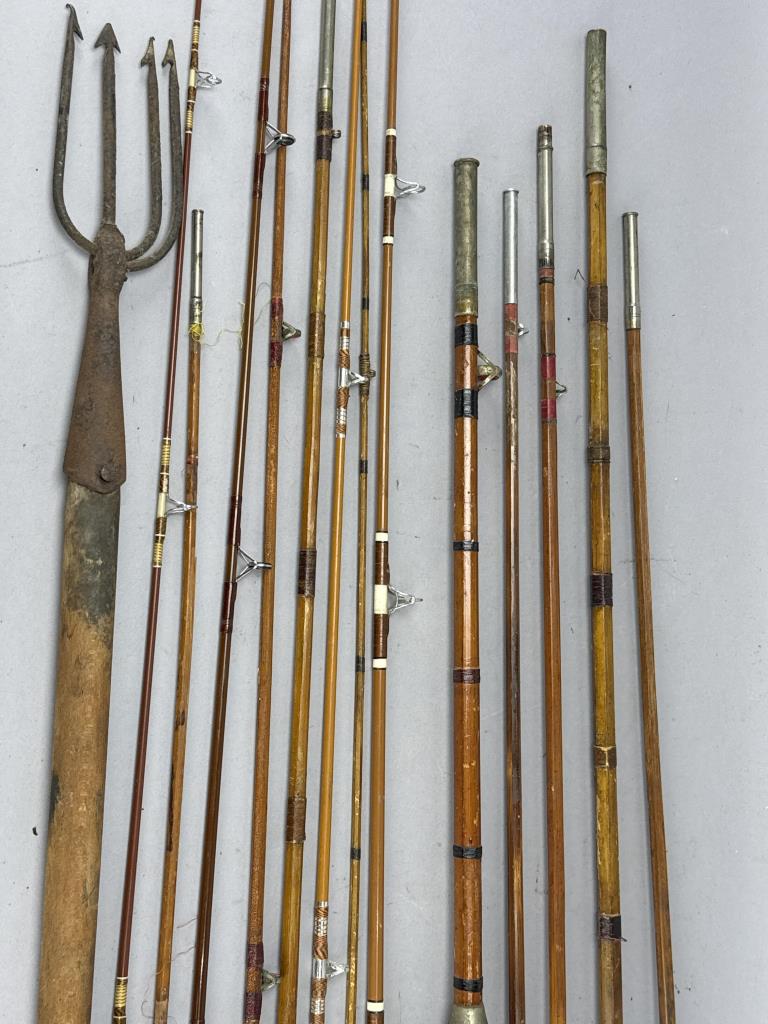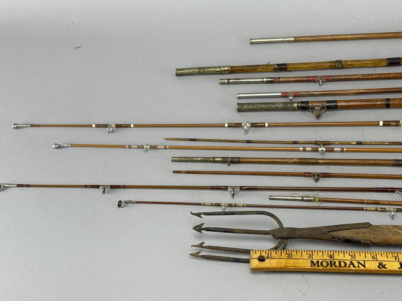 Lot of vintage fishing rods featuring a mix of wood and metal construction, including various lengths and styles. Components include cork and metal handles, along with metal ferrules and reinforced guides wrapped in thread. The rods show an assortment of craftsmanship techniques in the handles and rod guides, demonstrating a variety of designs. Also included is one vintage wooden fishing spear with a metal trident head. An excellent assortment of collectible and functional pieces for fishing enthusiasts or collectors.