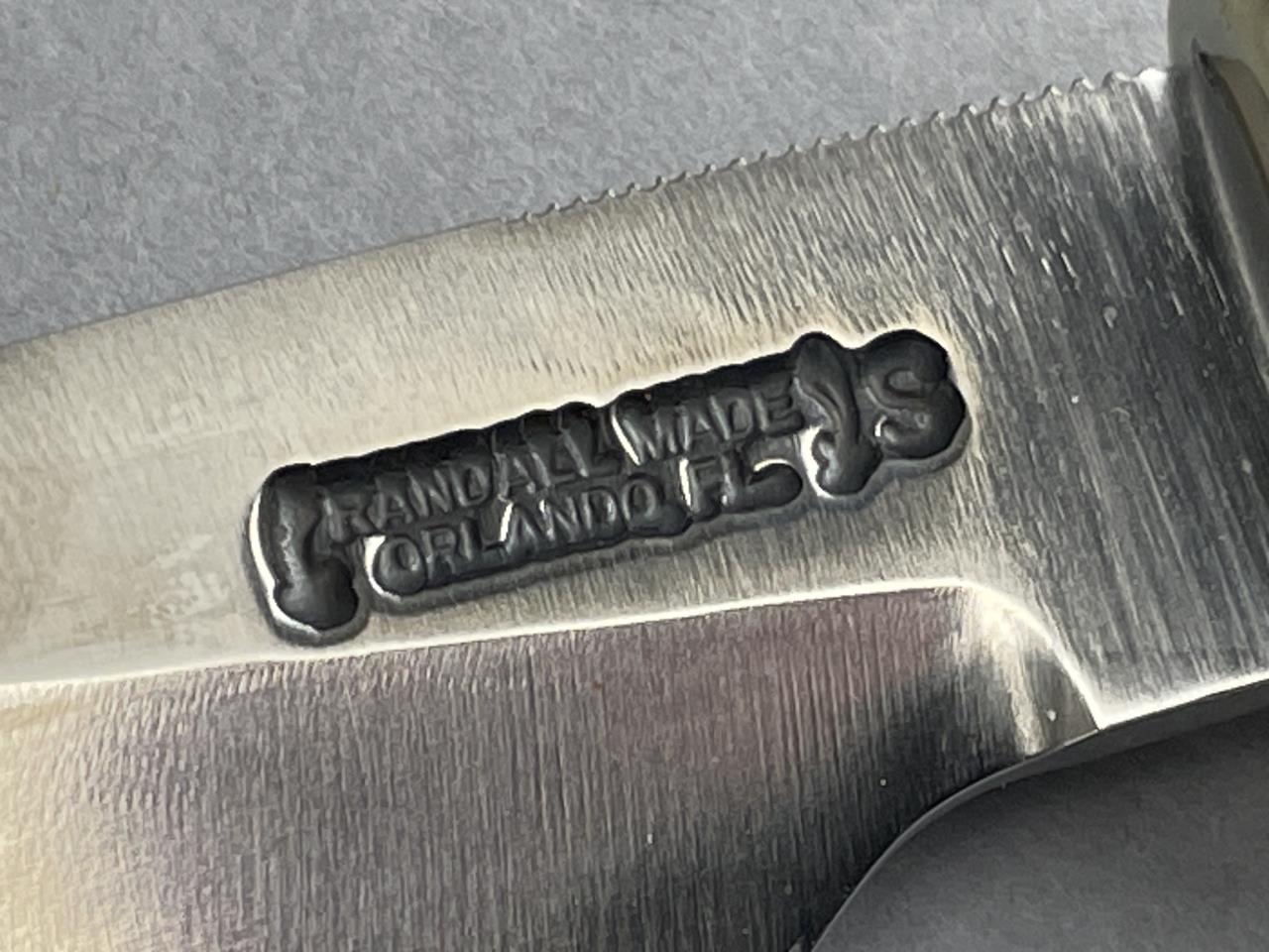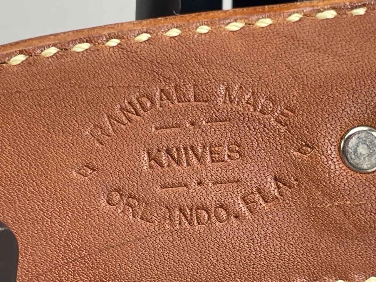 Randall Made Knife with a stainless steel blade featuring the ‘RANDALL MADE ORLANDO FLA’ marking. The knife includes a polished black handle with a lanyard hole and an attached black paracord lanyard. Accompanied by a brown leather sheath stamped with the Randall Made logo and ‘ORLANDO, FLA’. The sheath is secured by a metal spring clip on the back, designed for easy attachment.