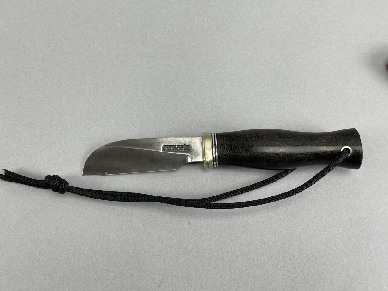 CONDITION: The knife is in very nice overall condition with a clean blade showing minimal handling marks. The black polished handle is intact, with no visible cracks or damage. The lanyard appears intact and untangled. The leather sheath is in similarly excellent condition, displaying light handling wear and no significant scuffs or tears. The stamping on both the blade and sheath is clear and legible. The metal clip shows light surface wear consistent with careful use.