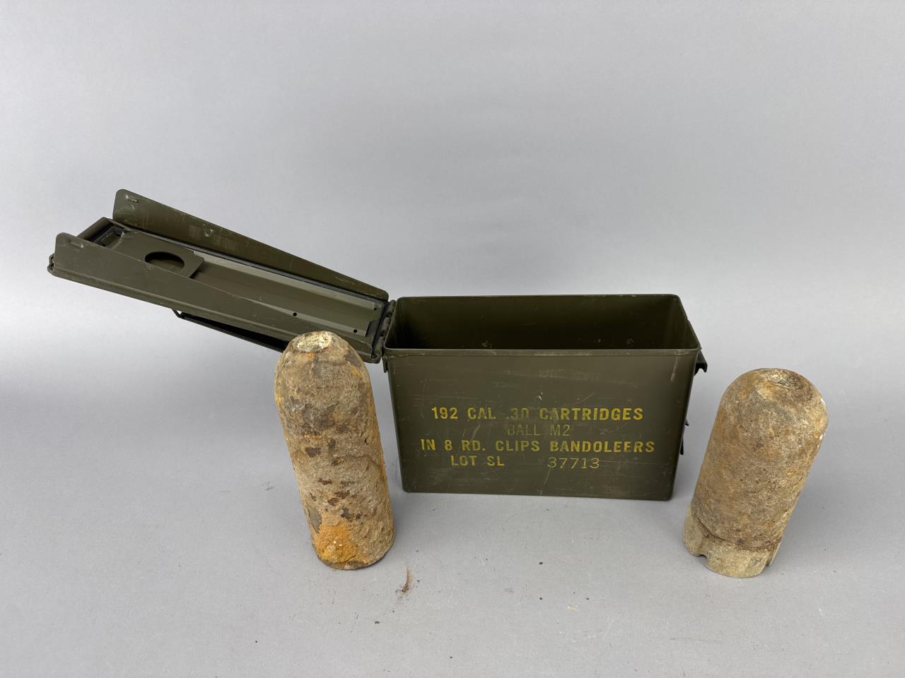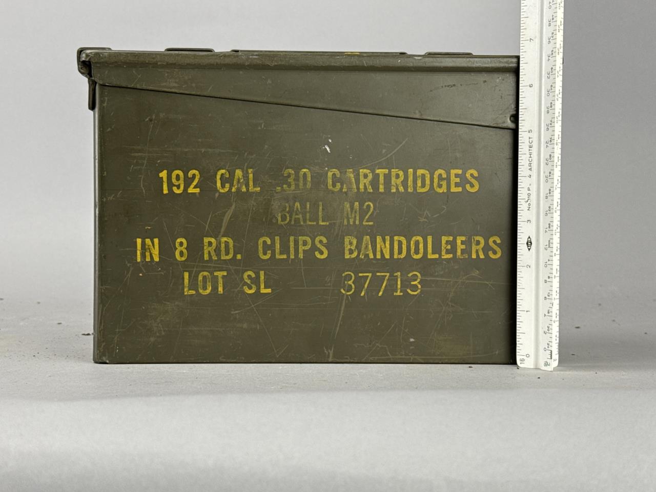 Civil War-era 3-inch Dyer pattern cannon shell accompanied by a surplus military-style ammunition box. The cannon shell is cast iron, with visible signs of surface rust and patina consistent with age. The included olive-drab-painted steel ammunition box, marked ‘192 CAL .30 CARTRIDGES BALL M2 IN 8 RD. CLIPS BANDOLIERS LOT SL 37713,’ measures approximately 11 inches in length and 3.75 inches in depth. This artifact offers historical interest and is suitable for display or collection purposes.
