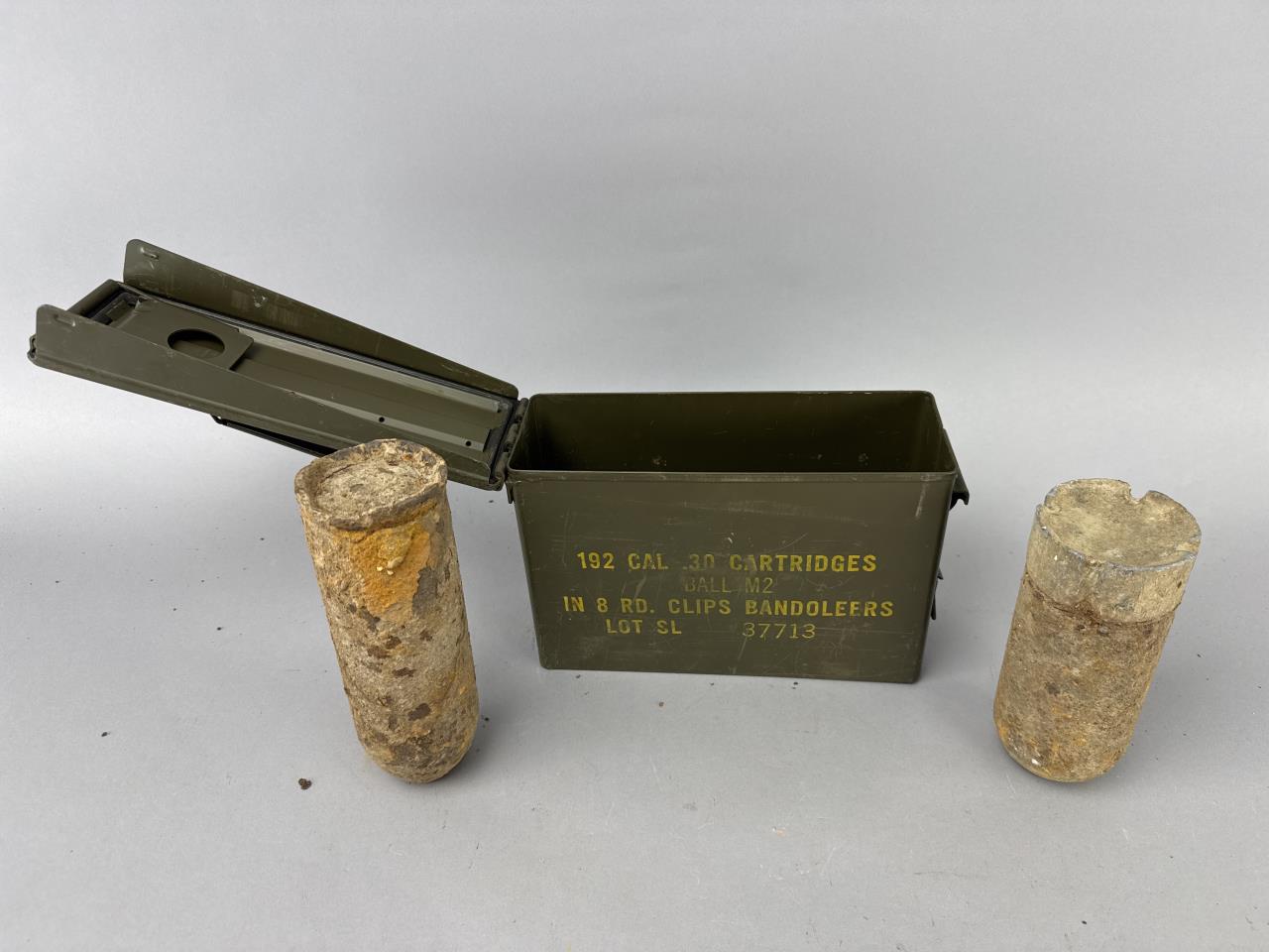 CONDITION: The Dyer pattern cannon shell exhibits notable surface rust, oxidation, and weathering, consistent with prolonged exposure and its historical age. The ammunition box shows surface wear, scratches, and some paint loss, particularly at edges and corners, with no structural damage noted. The lid opens and closes properly, and the markings remain legible.