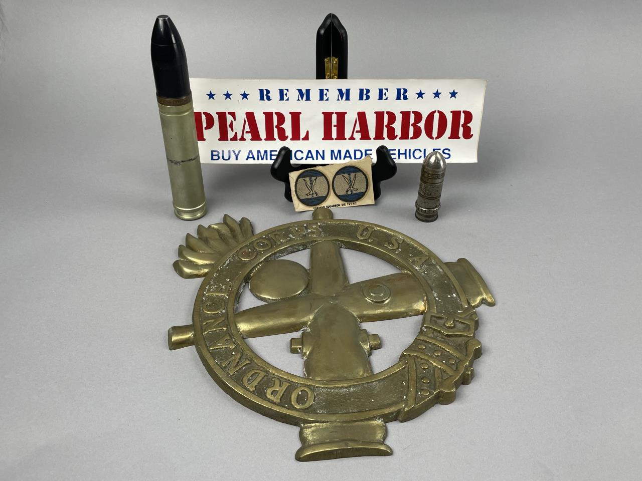 A varied collection of vintage military and commemorative items, including a metal U.S. Army Ordnance Corps emblem, two realistic-looking replica artillery shells, a ‘Remember Pearl Harbor’ sticker promoting American-made vehicles, and a Torpedo Squadron Six (VT-6) embroidered patch. The Ordnance Corps emblem features detailed raised lettering and imagery cast in what appears to be a brass-like material. The replica shells are constructed from metal with a high level of realism, and the embroidered patch is affixed to a piece of vintage cardboard. All items exhibit a nostalgic historical vibe, suitable for display or memorabilia enthusiasts.