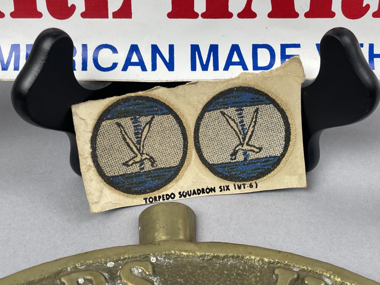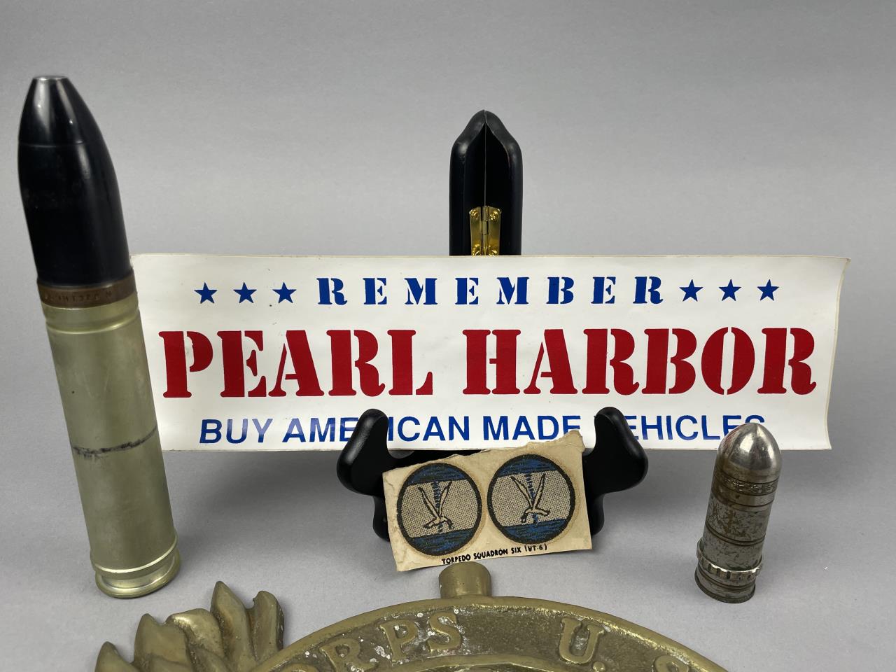 CONDITION: The metal U.S. Army Ordnance Corps emblem shows minor surface wear consistent with age and handling, with light scratches and slight patina visible. The replica artillery shells show some discoloration and light scuffing but maintain an overall authentic appearance. The ‘Remember Pearl Harbor’ sticker has minor creases and edge wear but remains vibrant and legible. The Torpedo Squadron Six embroidered patch is in fair condition with some discoloration and aging to the attached cardboard. No significant structural damage observed across all items.