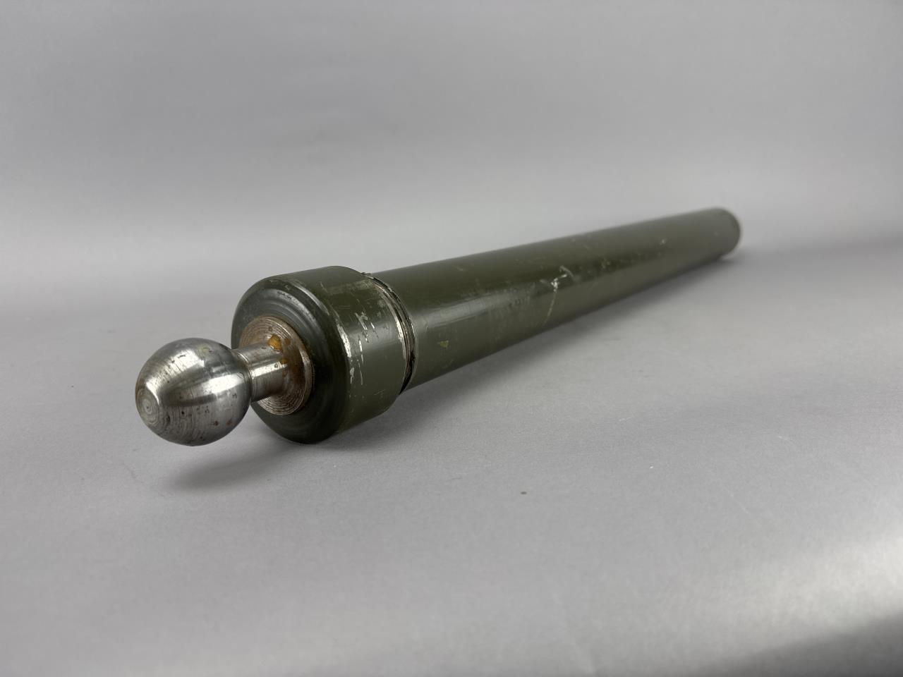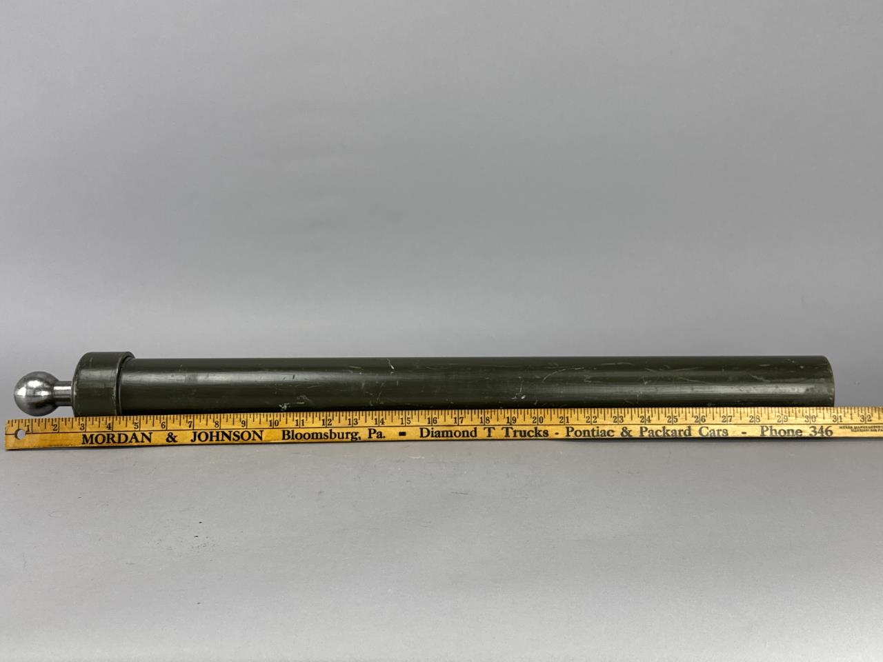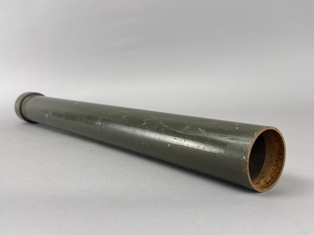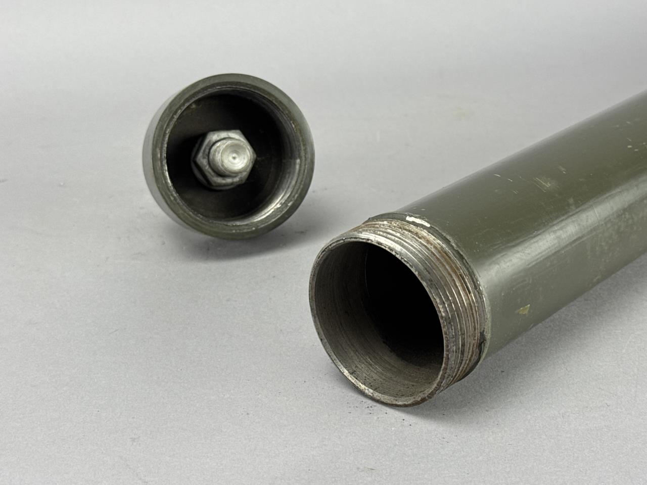 CONDITION: The exterior surface of the barrel exhibits scattered scratches, areas of paint loss, and minor finish wear indicative of prior use. The threaded end cap operates smoothly, though light corrosion is evident within the threads and inner surfaces of the barrel. No significant structural damage is visible, and the item appears stable for display or collector purposes. Additional cleaning may be required to address interior surface corrosion.