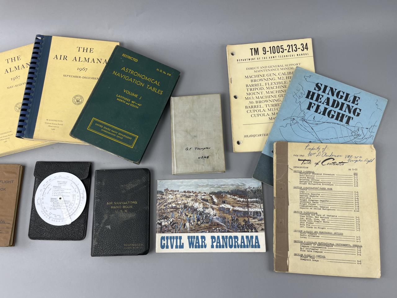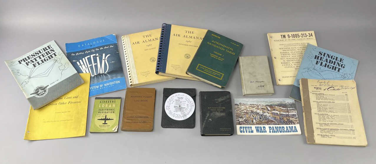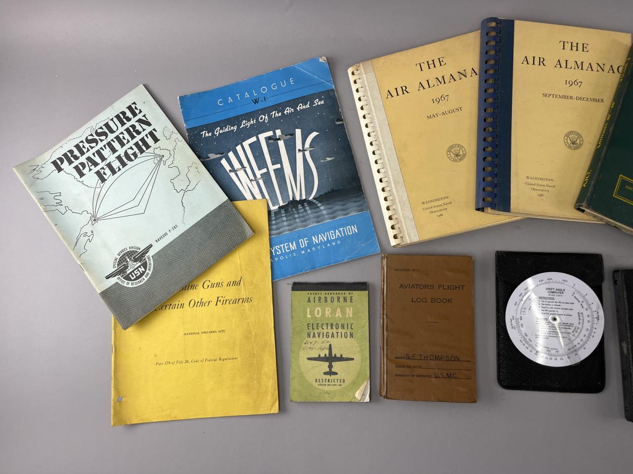 CONDITION: The collection displays general handling wear consistent with age and use. Some covers show scuffing, edge wear, and markings, with notable annotations present on select items, such as personal inscriptions and user-specific notes (e.g., G.F. Thompson, U.S. Marine Corps). Binding is intact across most books, though some edge fraying and discoloration are evident. Pages appear legible and complete, with signs of aging including yellowing and minor staining on some texts. Navigational tools, such as flight calculation references, are visibly present and in functional condition where applicable.