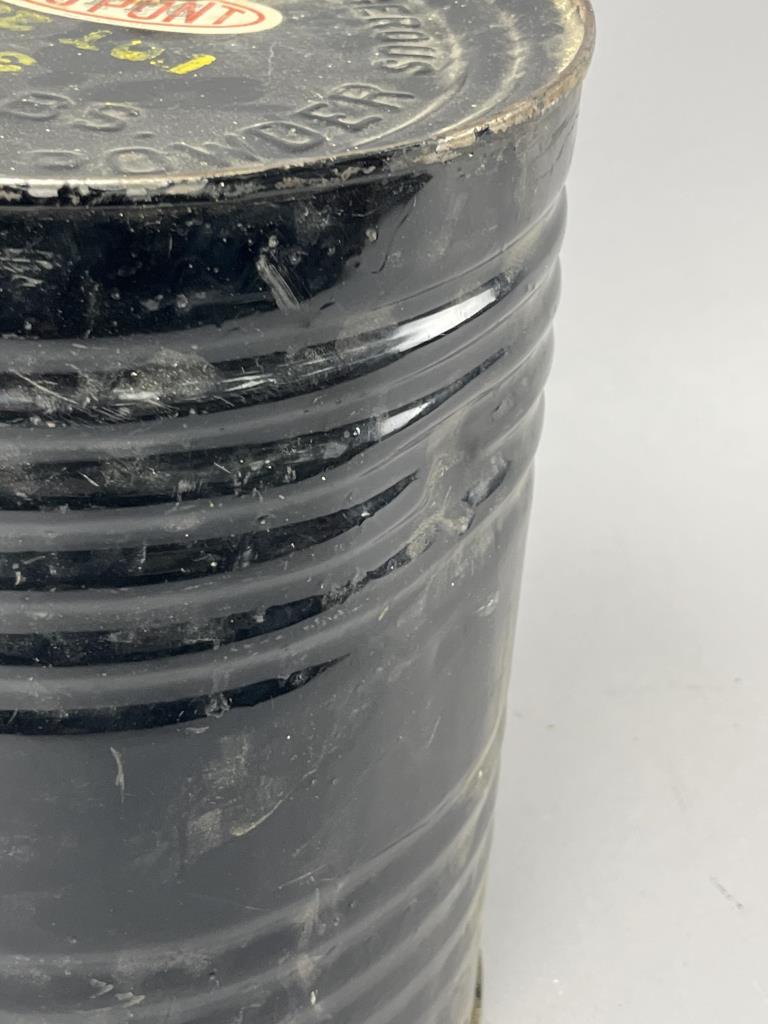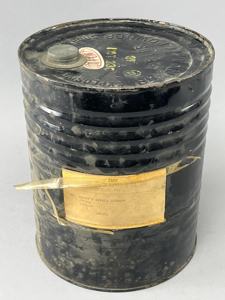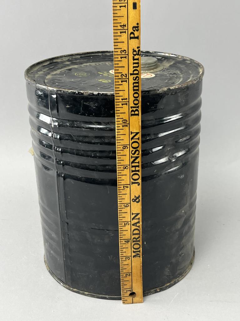 CONDITION: The tin shows moderate handling wear, consistent with age and storage. The black-painted exterior exhibits areas of scuffing, scratching, and surface abrasions. The paper shipping label is partially torn with some loss, but text remains largely legible. The metal cap and lid show wear but appear intact. No visible punctures or structural dents in the body of the tin were observed. Please note this item cannot be shipped and is for local pickup only due to hazmat restrictions.
