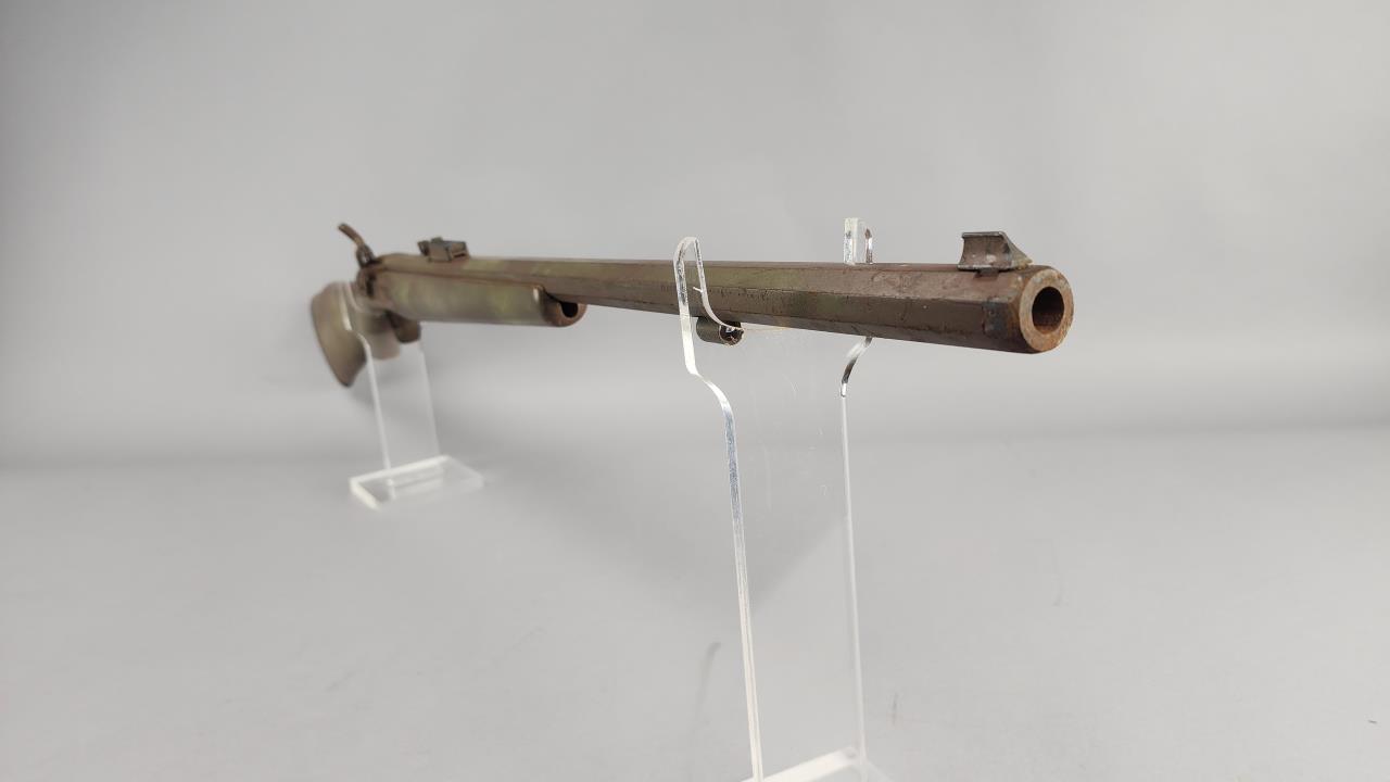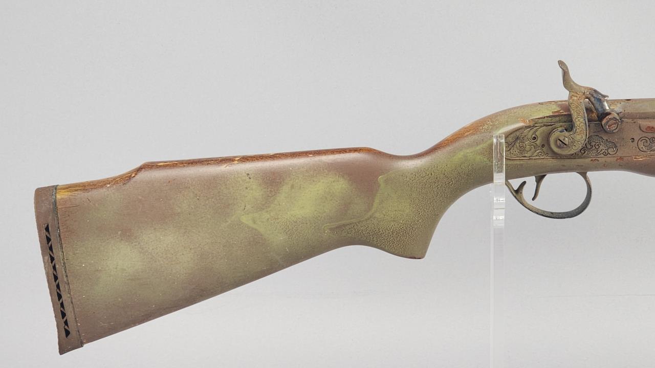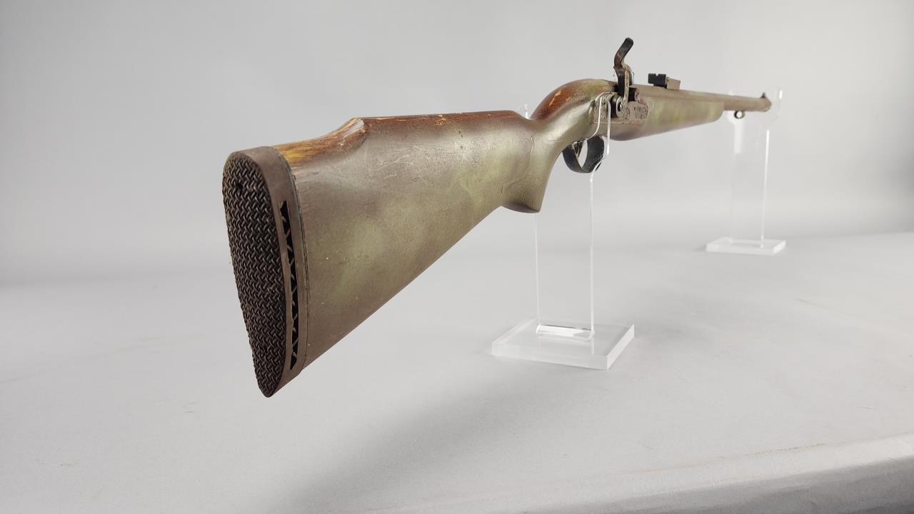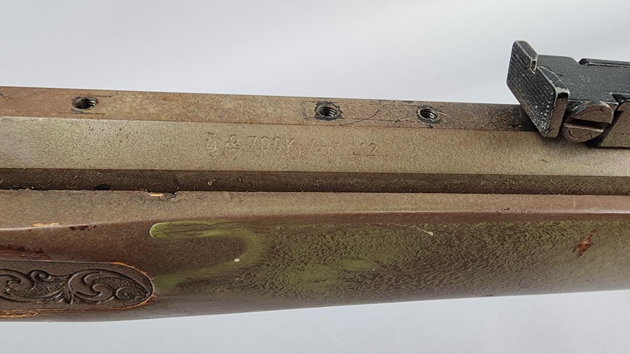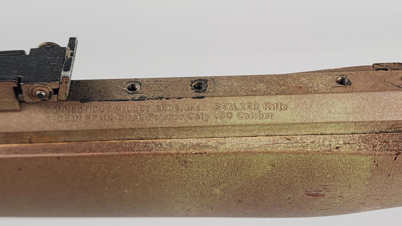 CONDITION: The rifle exhibits heavy wear consistent with age and use. The synthetic stock shows scuffs, scratches, and noticeable finish loss, particularly around the edges. The barrel has a patinated finish with visible wear, spots of corrosion, and scratches throughout. The engraving remains distinguishable but shows surface wear. The trigger mechanism and hammer appear functional, but detailed operation testing was not conducted. Bore condition is unconfirmed due to lack of clear visibility. Local pickup only due to black powder classification.