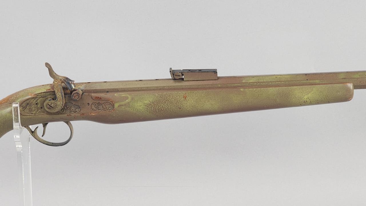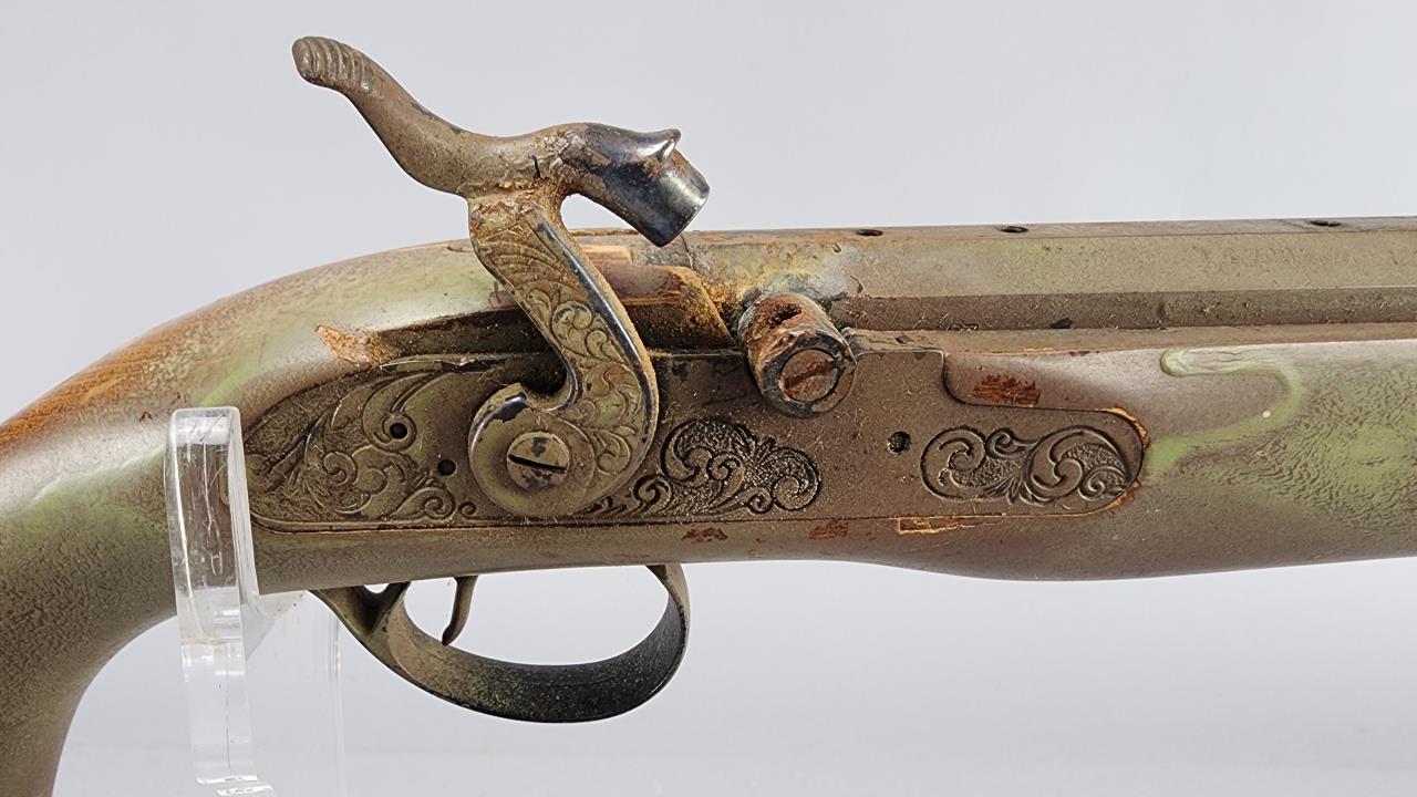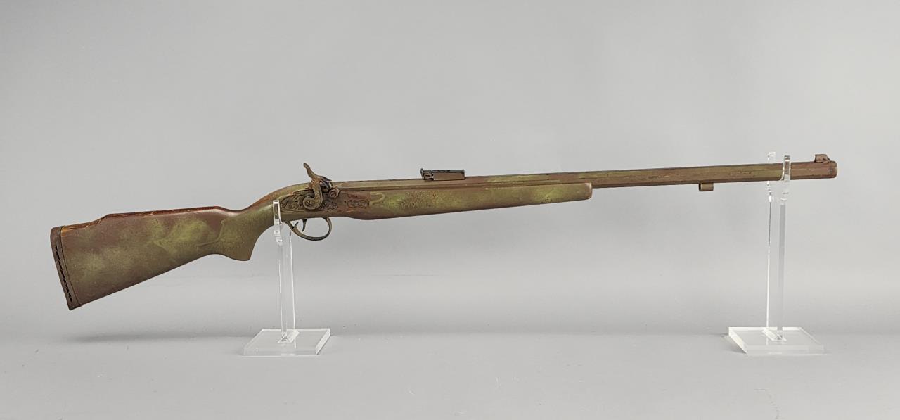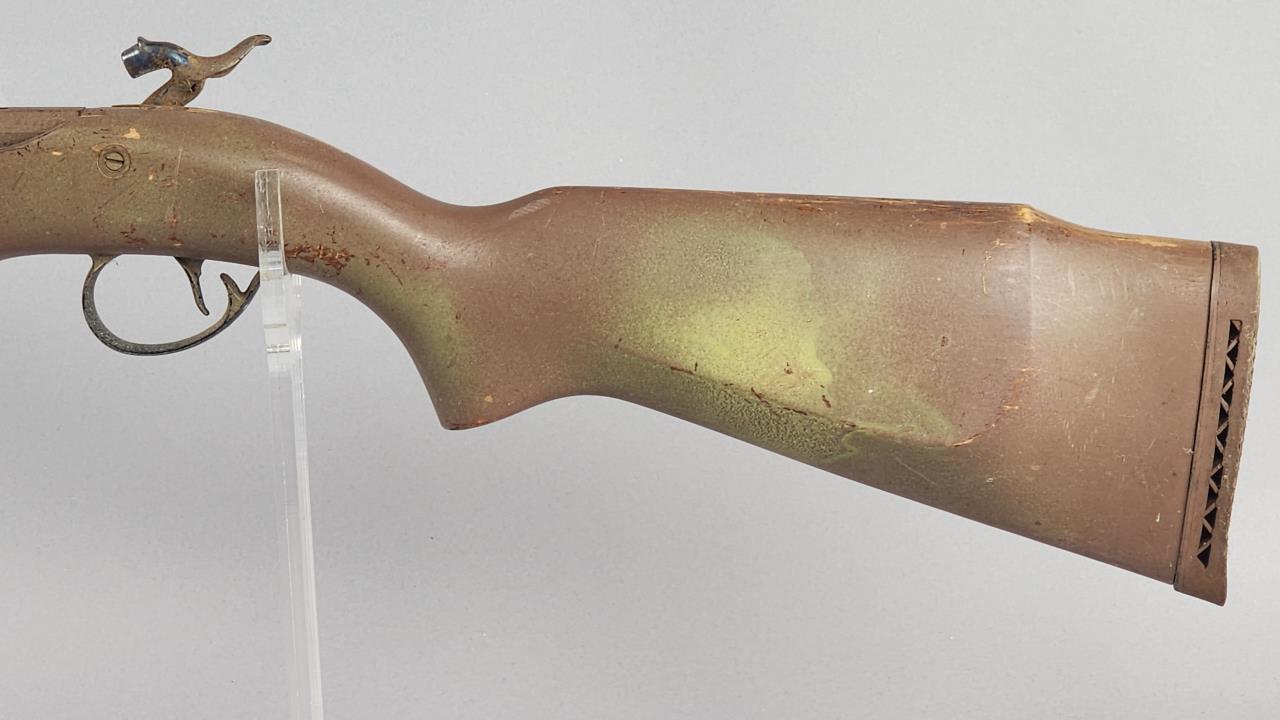 CONDITION: The rifle exhibits heavy wear consistent with age and use. The synthetic stock shows scuffs, scratches, and noticeable finish loss, particularly around the edges. The barrel has a patinated finish with visible wear, spots of corrosion, and scratches throughout. The engraving remains distinguishable but shows surface wear. The trigger mechanism and hammer appear functional, but detailed operation testing was not conducted. Bore condition is unconfirmed due to lack of clear visibility. Local pickup only due to black powder classification.