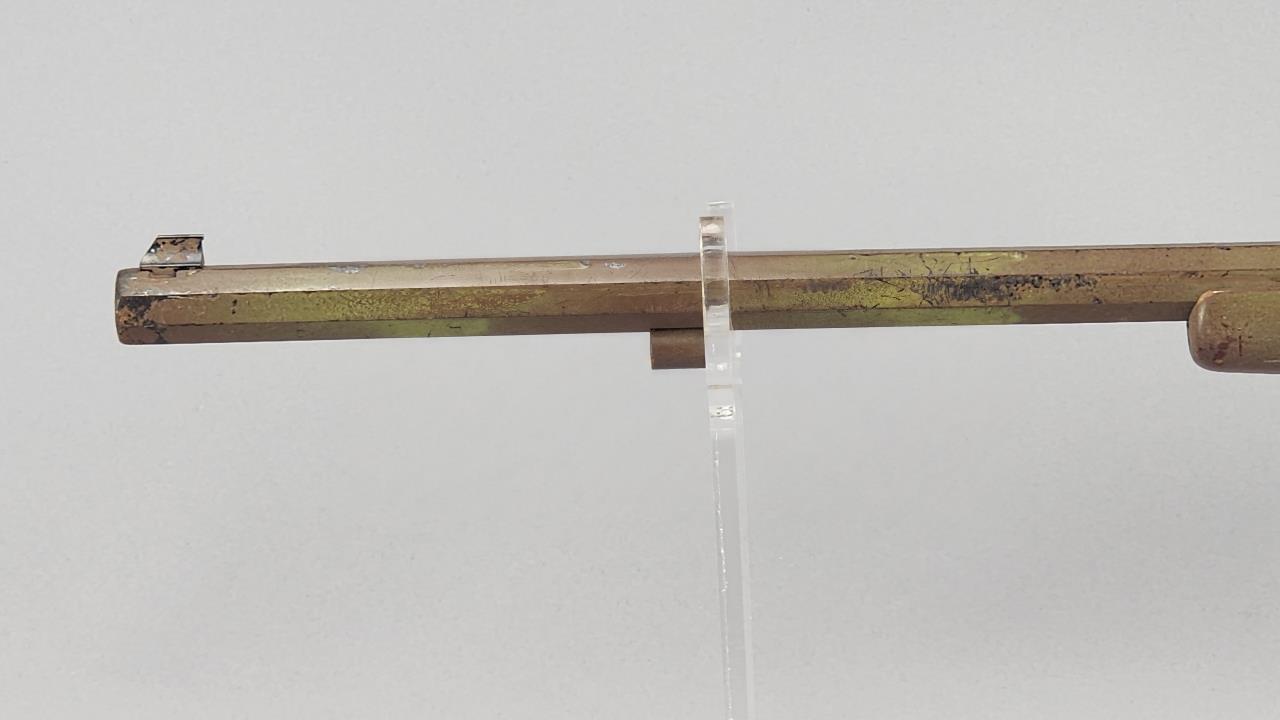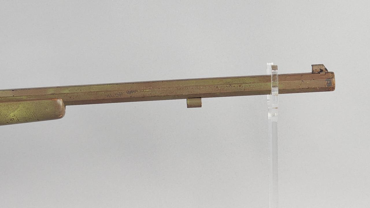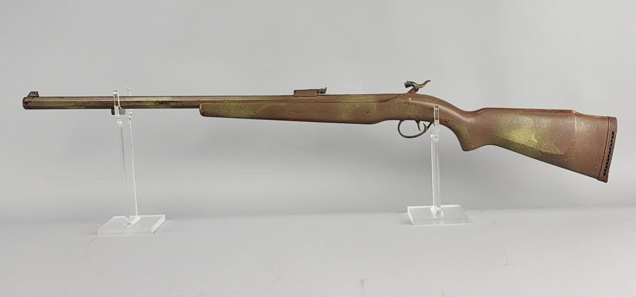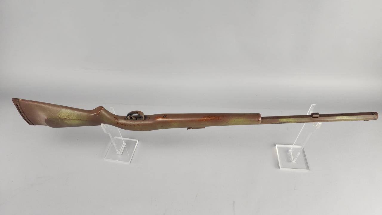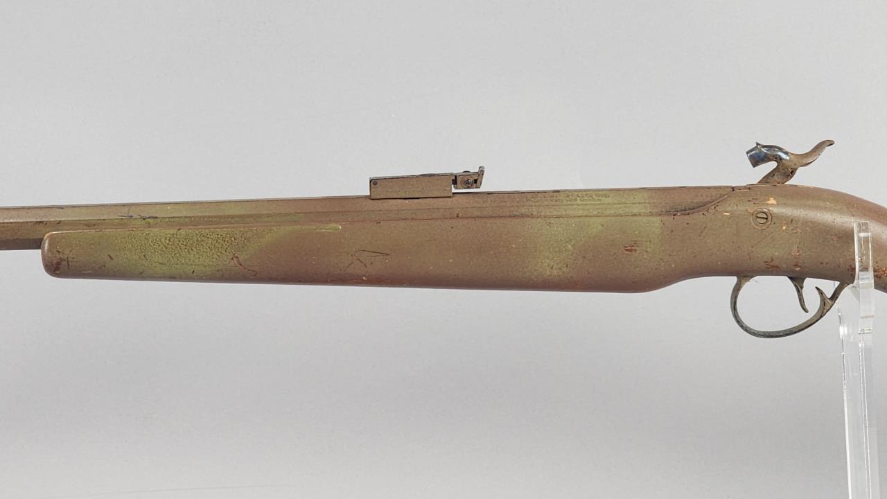 CONDITION: The rifle exhibits heavy wear consistent with age and use. The synthetic stock shows scuffs, scratches, and noticeable finish loss, particularly around the edges. The barrel has a patinated finish with visible wear, spots of corrosion, and scratches throughout. The engraving remains distinguishable but shows surface wear. The trigger mechanism and hammer appear functional, but detailed operation testing was not conducted. Bore condition is unconfirmed due to lack of clear visibility. Local pickup only due to black powder classification.
